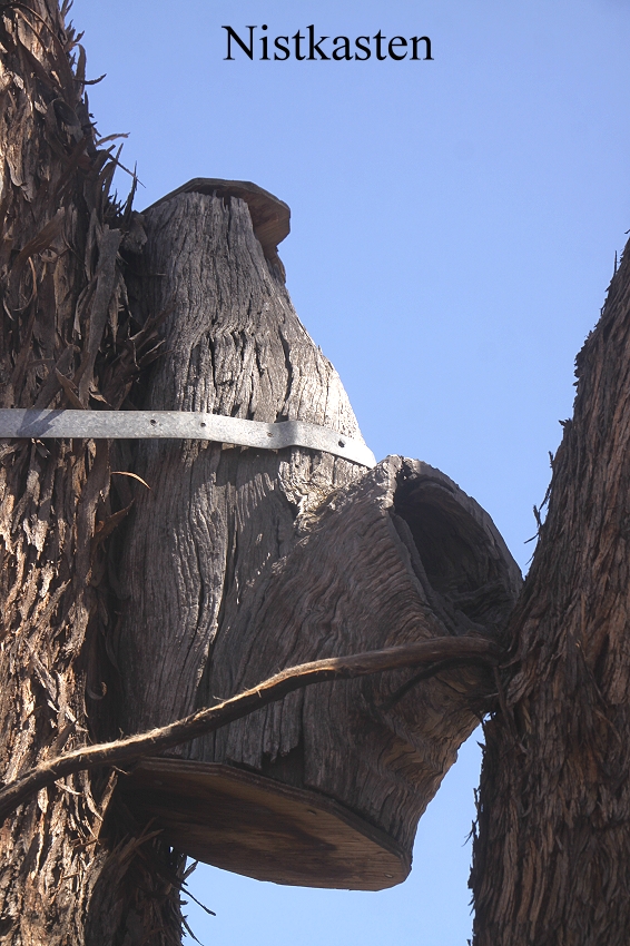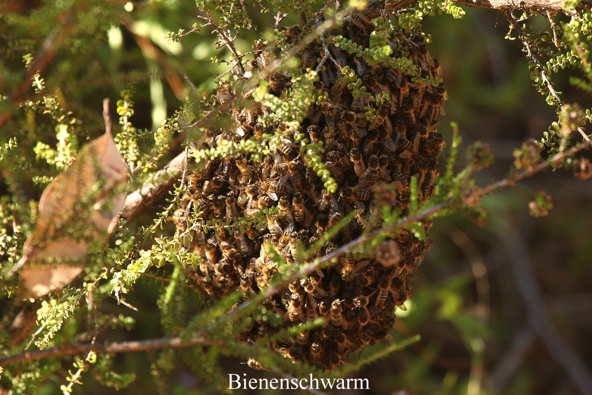 sowie Red-capped Parrots und ein Currawong mit seinem mächtigen Schnabel. Am Weg in einem Gebüsch entdeckten wir einen braunen Klumpen in den Zweigen, groß wie eine Kokosnuss. Beim näheren Hinsehen entpuppte sich der Klumpen als ein Bienenschwarm. Die einzelnen Bienen klebten förmlich zusammen, ein grotesker Anblick. |