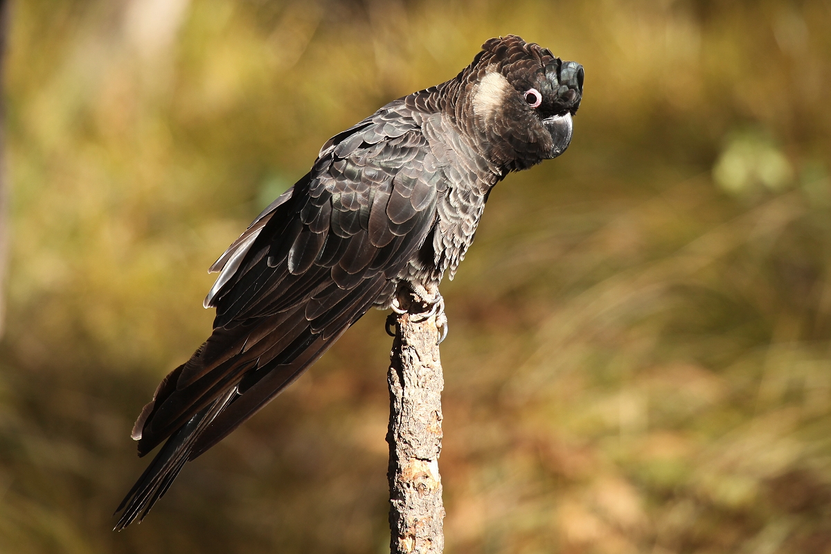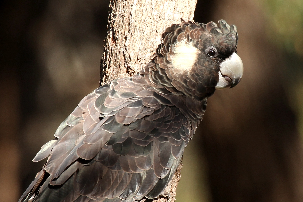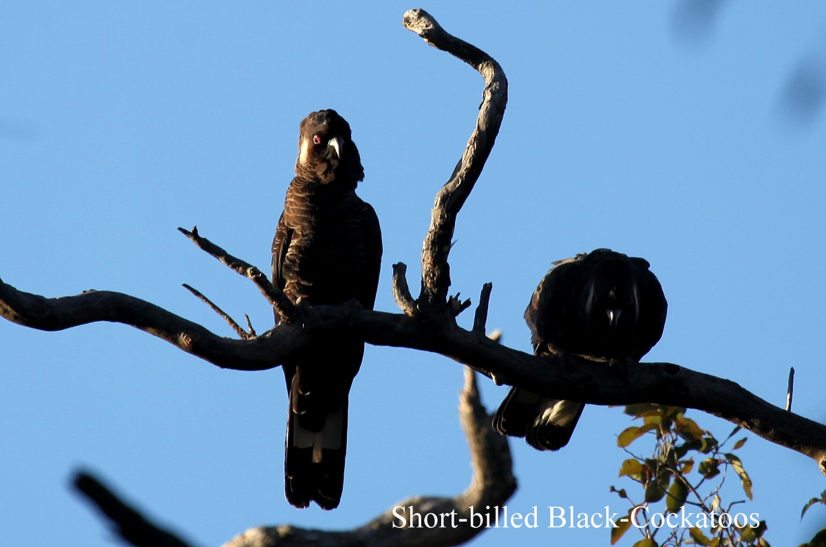 Im Licht der jetzt sehr tief stehenden Sonne fuhren wir langsam zu unserem Campingplatz zurück. Nochmals sahen wir am Straßenrand eine Gruppe schwarzer Short-billed Black-Cockatoos, die aber beim Näherkommen auf etwas entferntere Bäume flüchteten. |