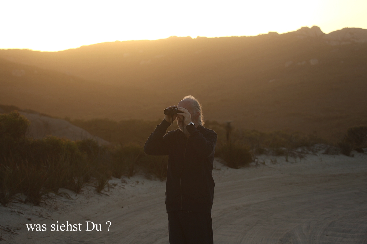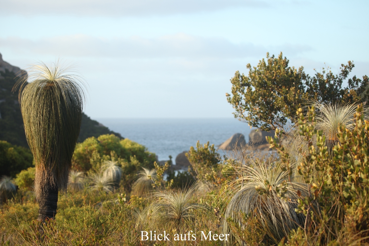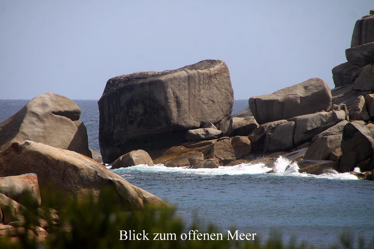 Wir gingen wieder zurück zum Auto und machten uns auf den Weg zum Waychinicup Nationalpark, der etwa 60 km weiter im Osten von Albany liegt. Die letzten 6 km führten über eine sehr enge und holprige Strecke. Am Ziel angekommen suchten wir zunächst nach einem passenden Platz zum Übernachten. Der Campingplatz in dichtem Gebüsch (Heath) gelegen, hat nur wenige Stellplätze. Alle waren belegt bis auf einen, den wir schnell besetzten. Wir machten einen kleinen Spaziergang einen engen Pfad zum Meer hinunter. Die Aussicht auf eine Bucht, eingerahmt von mächtigen runden Felsen mit einer engen Verbindung zum Meer, war beeindruckend. |