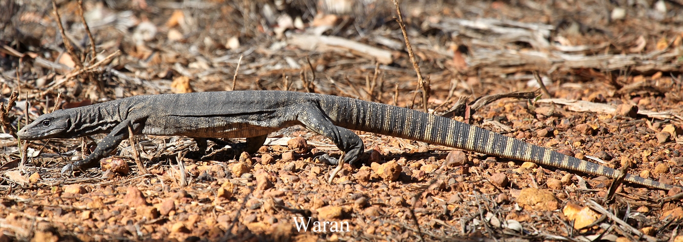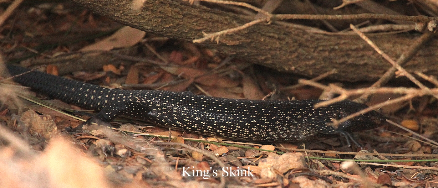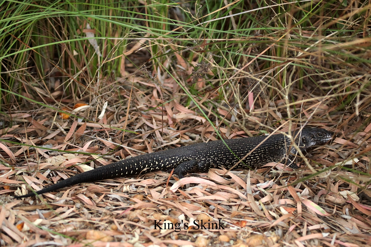 Wir studierten auch anhand unseres I-Pods die Stimmen der hier vorkommenden, aber vom Aussterben bedrohten Vögel (Western Whipbird, Noisy Scrub-Bird, Western Bristlebird). Der Ruf des Noisy Scrub-Birds ähnelt dem unserer Nachtigall. Vielleicht können wir ja wenigstens ihre Stimmen hören. Gegen 16.30 h fing Tomoko an, ihre gekauften Lebensmittel in die Schränke einzuräumen. Anschließend begann sie mit den Vorbereitungen zum Abendessen. Dieses schmeckte wieder hervorragend, Reis mit grünem Gemüse (Pakchoi, Broccoli, Tofu), das ganze abgeschmeckt mit chinesischer Knoblauchsauce. Dazu tranken wir ein kühles Bier. Nach dem Abendessen machten wir noch einen kleinen Spaziergang. Wir gingen etwa 300 m den Sandweg hinauf, den wir gekommen waren. Rechts am Rand sah ich ein schwarzes Tier mit gelben Punkten sich schnell im Gebüsch versteckend. Zunächst dachten wir beide an eine Schlange, doch dann Entwarnung, es war eine große Eidechse (King's Skink) |
