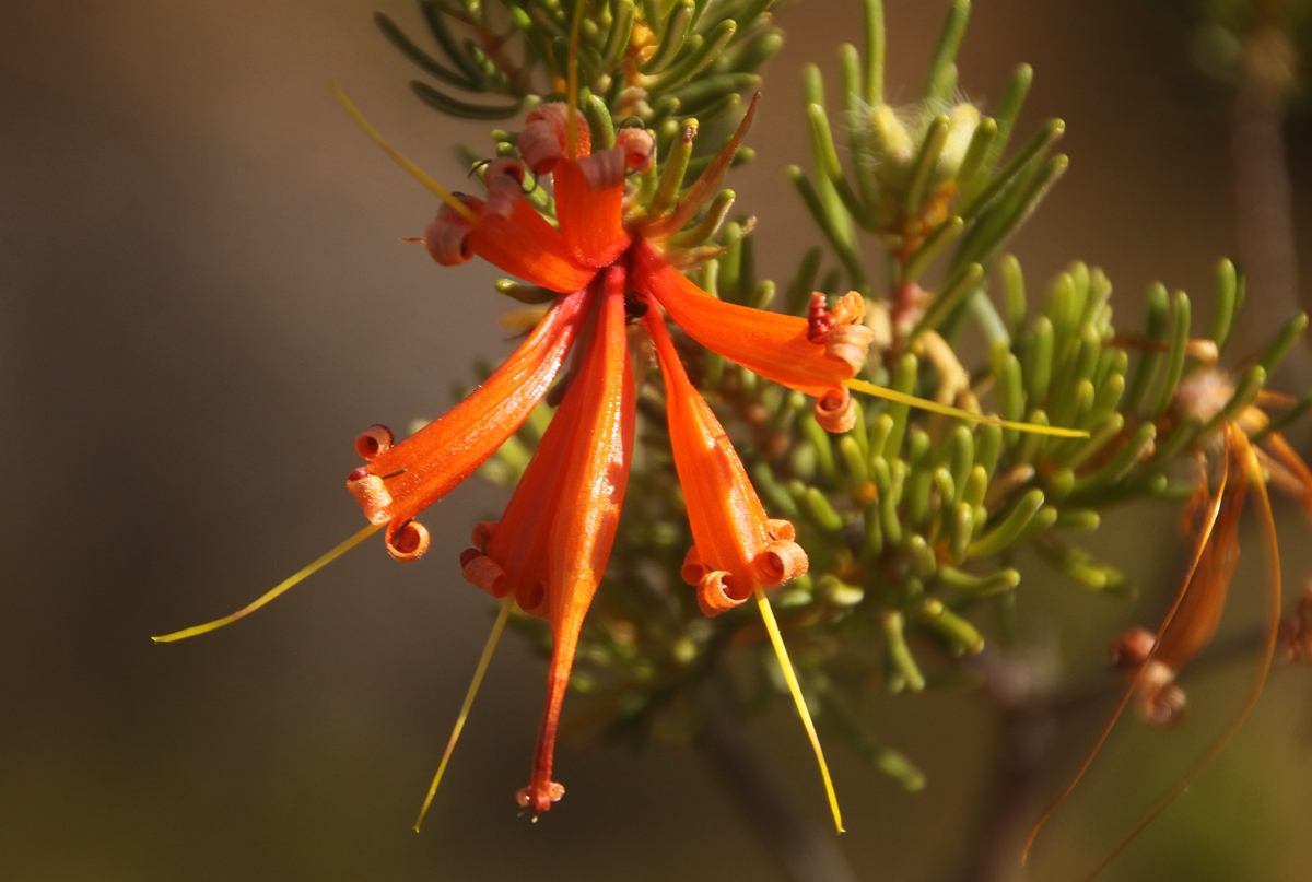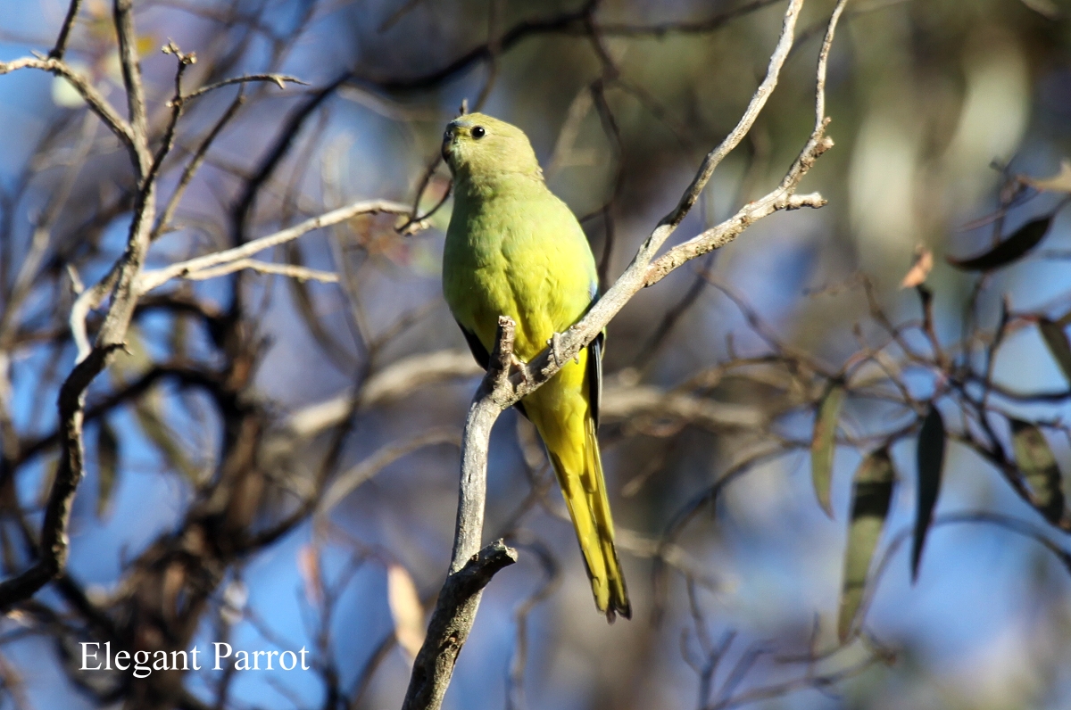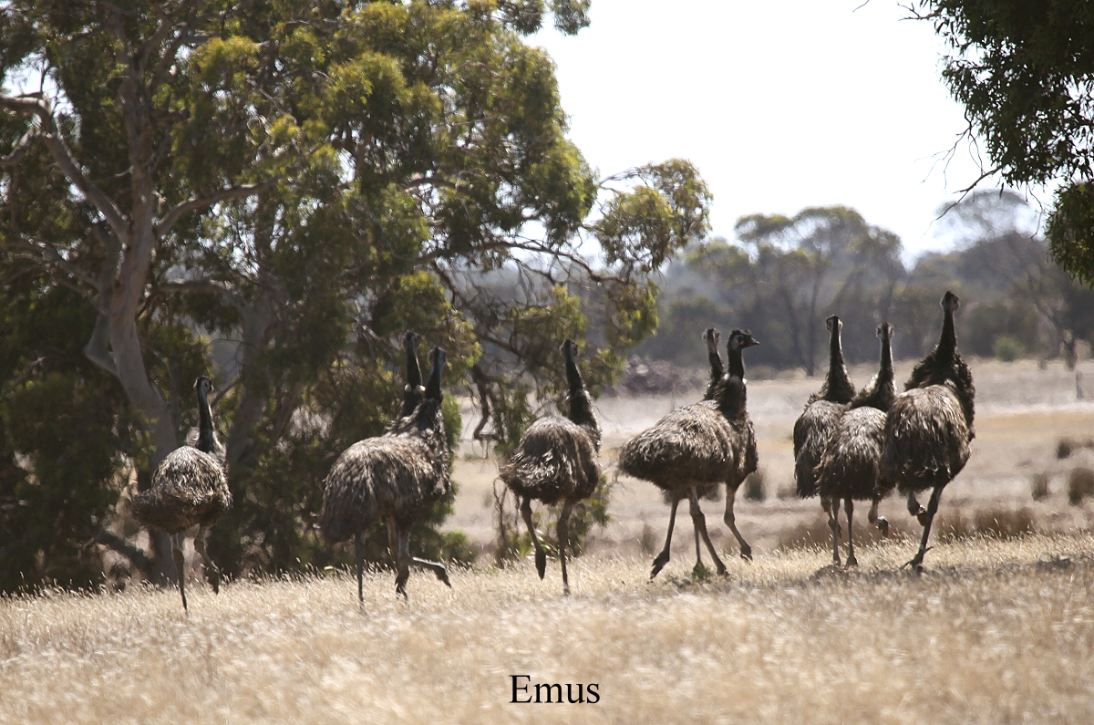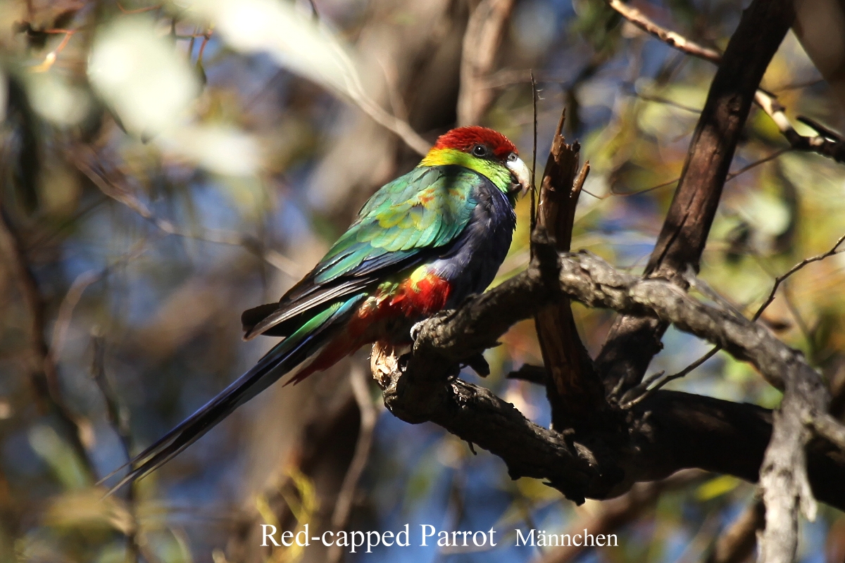 Gegen 10.00 h erreichten wir die Red-Gum-Pass-Road, das westliche Ende des Nationalparks. Von hier führte eine Straße (Salt River Road), die teilweise asphaltiert ist, wieder zurück. Mehrfach sahen wir in den abgeernteten Weizenfeldern Gruppen von Emus durch die Landschaft laufen. Einmal waren es mehr als 30 Exemplare, ein andermal eine Emu-Familie, 2 Eltern mit mehreren Jungen. Auch zwei Red-capped Parrots zeigten sich kurz in einem Baum. Für ein Belegfoto reichte die Zeit noch, bevor sie wieder im Gebüsch verschwanden. |