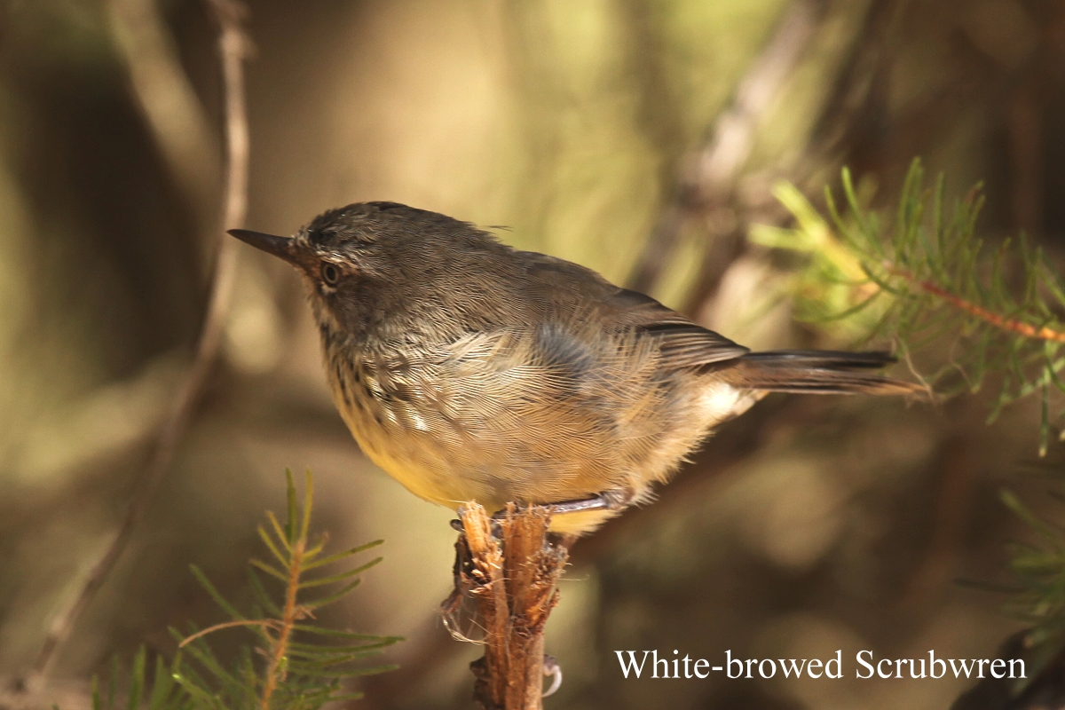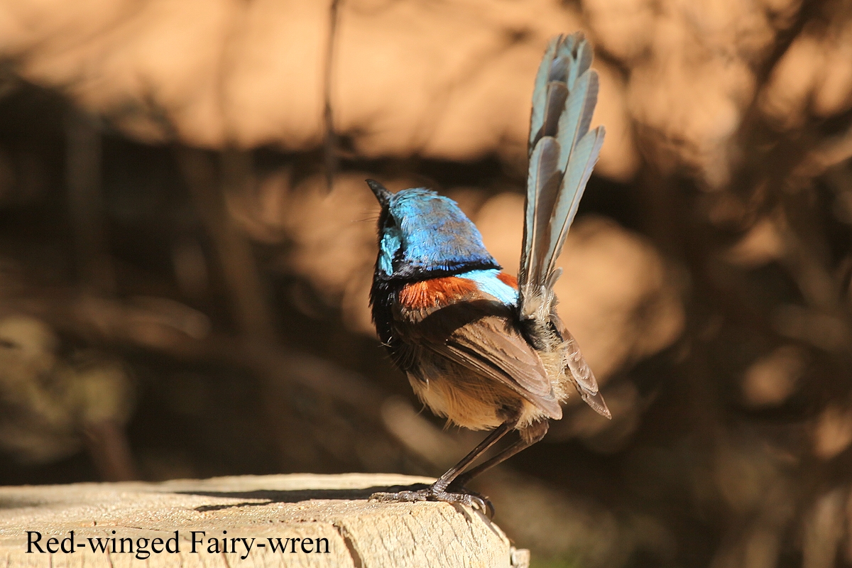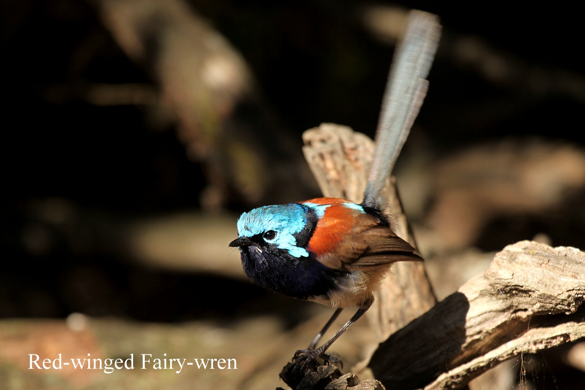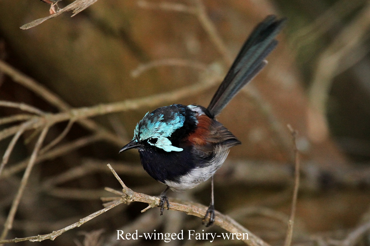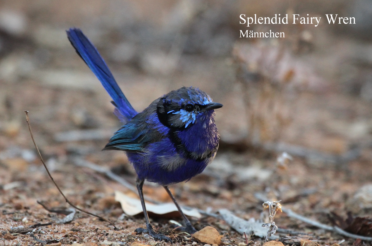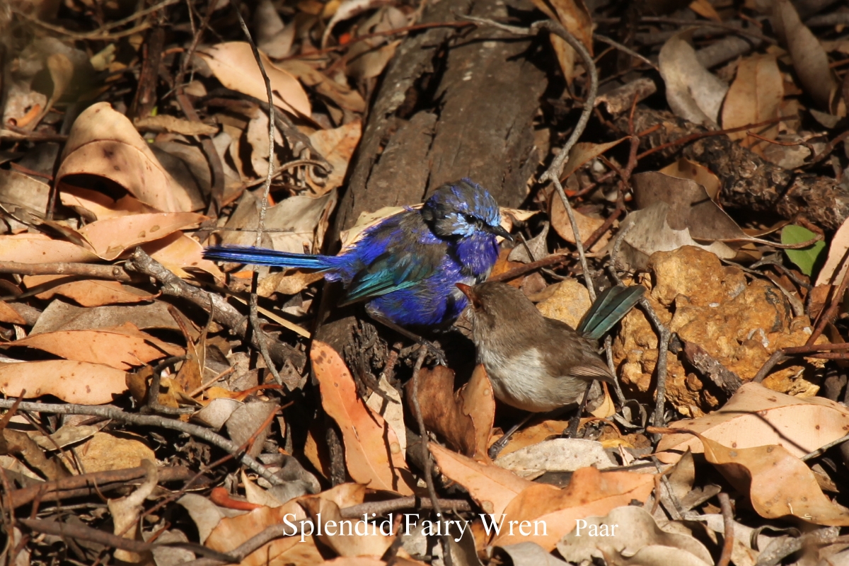 Doch es war sehr still. Tomoko war schon etwas traurig. Wir gingen zum Auto zurück und setzten uns erst mal in unsere Campingsessel. Zwei Nächte wollten wir hier bleiben, aber war das nicht zu langweilig…? Plötzlich erwachte Tomoko zu neuem Leben. Ein kleiner leuchtend blauer Schatten huschte durchs Gebüsch. Diese intensiv blaue Farbe gibt es nur in Australien. Es war ein männlicher Red-winged Fairy-wren, dem auch bald ein Weibchen folgte. Sofort hatte Tomoko ihre Kamera in der Hand und versuchte Fotos von dem quirligen kleinen Kerl zu machen, was ihr auch nach etlichen Versuchen bestens gelang. Auch ein White-browed Scrubwren huschte durchs Gebüsch. Der Tag war gerettet und der Plan, 2 Nächte hier zu bleiben, schien gut zu sein. |