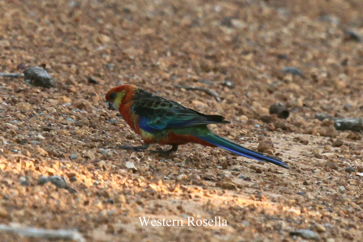 Wie geplant wachten wir um 5.10 h auf. Da wir sehr früh zu dem Campingplatz wollten, wo wir gestern Abend so viele Vögel gesehen hatten, verzichteten wir zunächst aufs Frühstück und packten schnell unsere Sachen zusammen, so dass wir um 5.30 h schon losfahren konnten. Die Sonne war noch nicht zu sehen, doch man konnte ihre Strahlen hinter dem Bluff Knoll, dem mit 1099 m höchsten Berg der Stirling Range, schon sehen. Nach einer knappen halben Stunde waren wir am Ziel. Auf dem Weg hatten wir einen sehr großen Schwarm Short-billed Black-Cockatoos am Straßenrand am Boden hocken sehen, mindestens 50 Stück. Wie ich gestern schon gesagt habe, suchten sie Weizenkörner, die vorbeifahrende mit Getreide beladene Lastwagen während der Fahrt verlieren. |