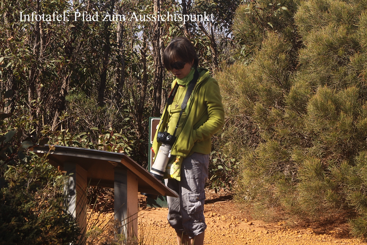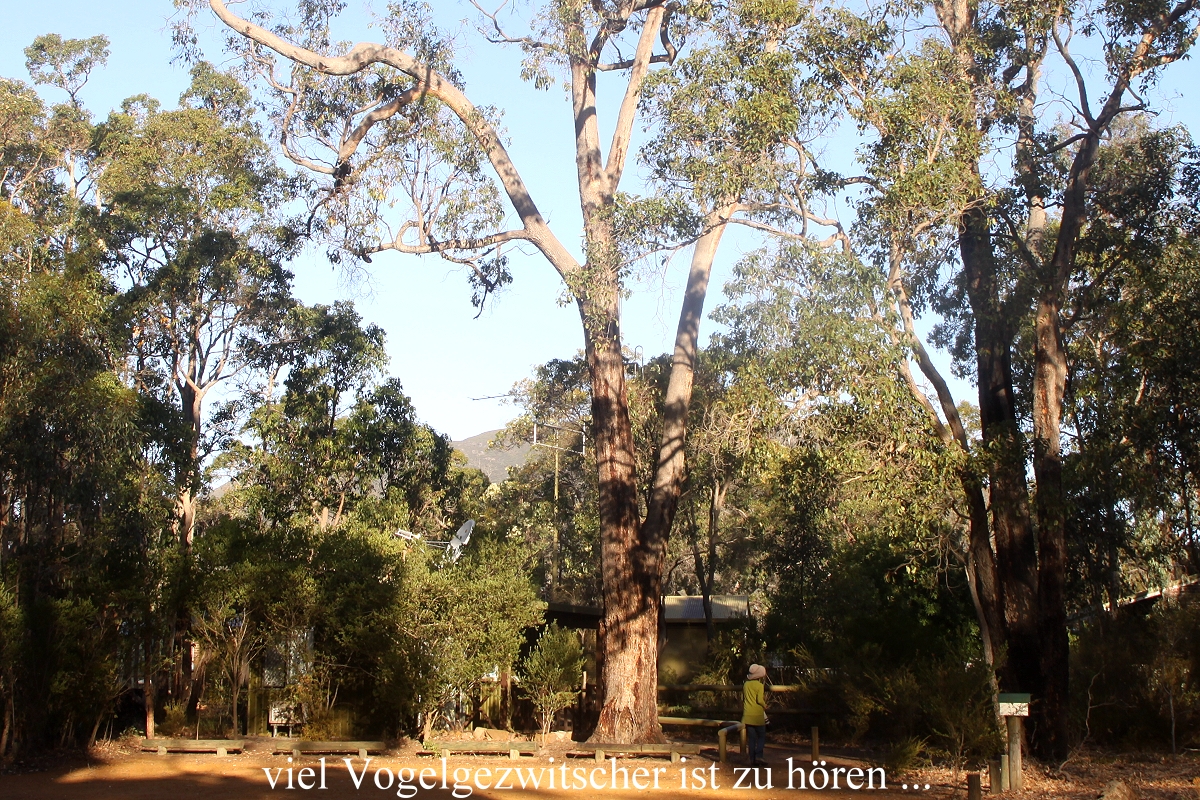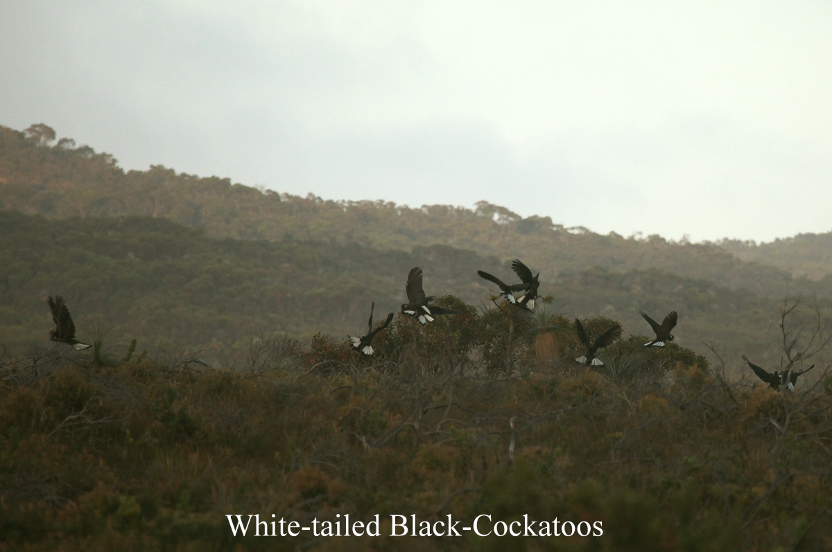 Um 5.00 h standen wir im Licht des anbrechenden Tages auf. Die aufgehende Sonne war noch hinter den Bergen versteckt. Tomoko nahm ihre Kamera in die Hand und ging schon mal langsam den Weg hinauf. Ich folgte wenige Minuten später. Beim Weggehen hörte ich mehrmals den Ruf des Western Whipbird aus der Ferne. Es war aber sonst nicht allzu viel los. In der Ferne konnten wir einige White-tailed Black-Cockatoos sehen. Ob es "short-billed" oder "long-billed" waren, konnten wir auf die Entfernung aber nicht erkennen. |