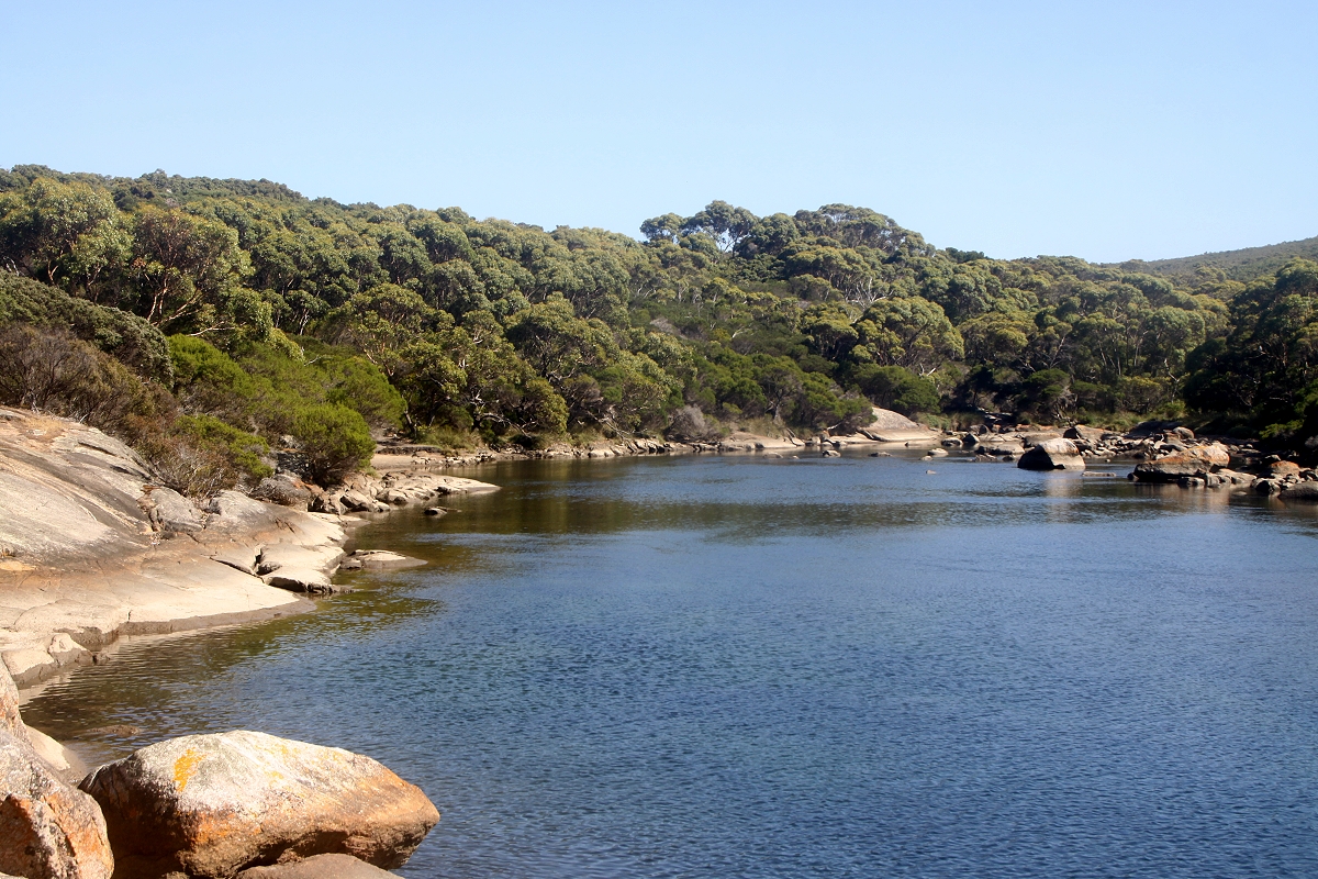 Wir waren etwa eine Stunde unterwegs und freuten uns jetzt auf ein Frühstück. Das nahmen wir ganz gemütlich ein. Anschließend gegen 8.30 h brach ich auf zu einer kleinen Wanderung. Ich wollte versuchen die Bucht am Ufer zu umrunden. Tomoko ging bis ans Wasser mit, doch als sie sah, dass es keinen Trail gibt, ging sie wieder zurück und ich versuchte es alleine. Das Unternehmen gestaltete sich aber recht mühsam. Kleine sandige Abschnitte wechselten mit Stellen, wo ich über große Felsbrocken klettern musste. Das war so was von anstrengend, dass ich nach einer Dreiviertelstunde das Unternehmen abbrach und umkehrte. Während ich unterwegs war, hatte Tomoko wieder Besuch von einem Red-winged Fairy-wren bekommen. |