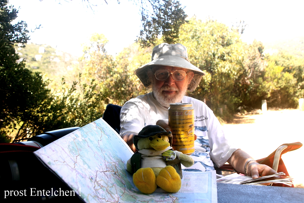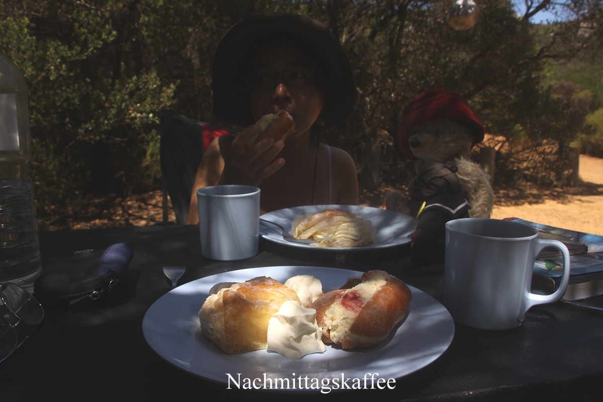 Der Tag war gerettet. Wir gingen zum Auto zurück und machten es uns in unseren Sesseln gemütlich. Ich las ein wenig. Gegen 10.00 h hatte Tomoko schon Hunger und packte die Reste von gestern Abend aus. Obwohl noch so früh am Tag, schmeckte ihr das "Mittagessen", zusätzlich mit einem Bier, vorzüglich. Das Bier gefiel natürlich auch Entelchen sehr. Bei mir meldete sich der Hunger erst gegen 11.00 h, als ich den Rest verzehrte. Danach zog ich meine Badehose an und ging ein wenig schwimmen. Die Wasseroberfläche in der Bucht war ruhig und spiegelglatt wie in einem See. Ich planschte ein wenig im glasklaren Wasser umher und setzte mich anschließend in die Sonne. Die brannte aber inzwischen so stark vom wolkenlosen Himmel, dass ich nach einer halben Stunde wieder zurückging. Bei der Gelegenheit hatte ich unsere Mülleimer mal gründlich im Wasser ausgespült. Ich las im Schatten der Sträucher meinen Spiegel weiter. Irgendwann bekamen wir Lust auf Kaffee und Kuchen. Tomoko hatte gestern sehr leckere Kuchenstücke gekauft, die wir uns jetzt bei einem Kaffee schmecken ließen. Auch unsere Bären waren begeistert. |