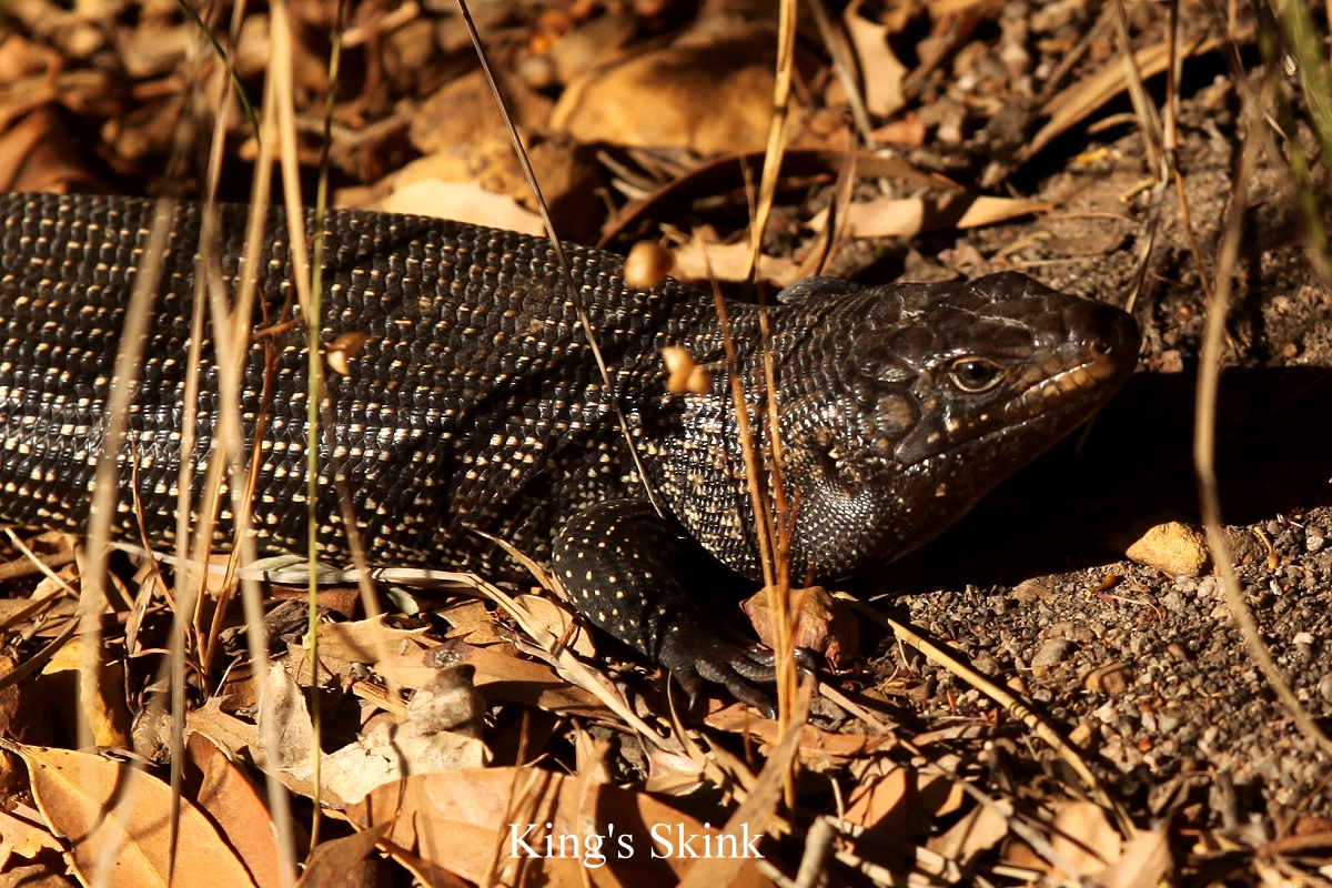 Der Noisy Scrub-bird war schon laut rufend tätig und spottete offensichtlich über unsere Bemühungen ihn zu finden. Als die Sonne es über den Berg geschafft hatte, wurde es mit einem Mal wärmer. Die grüne Landschaft leuchtete jetzt in einer kräftigen Farbe. Am Wegesrand tauchte wieder ein King's Skink auf. |