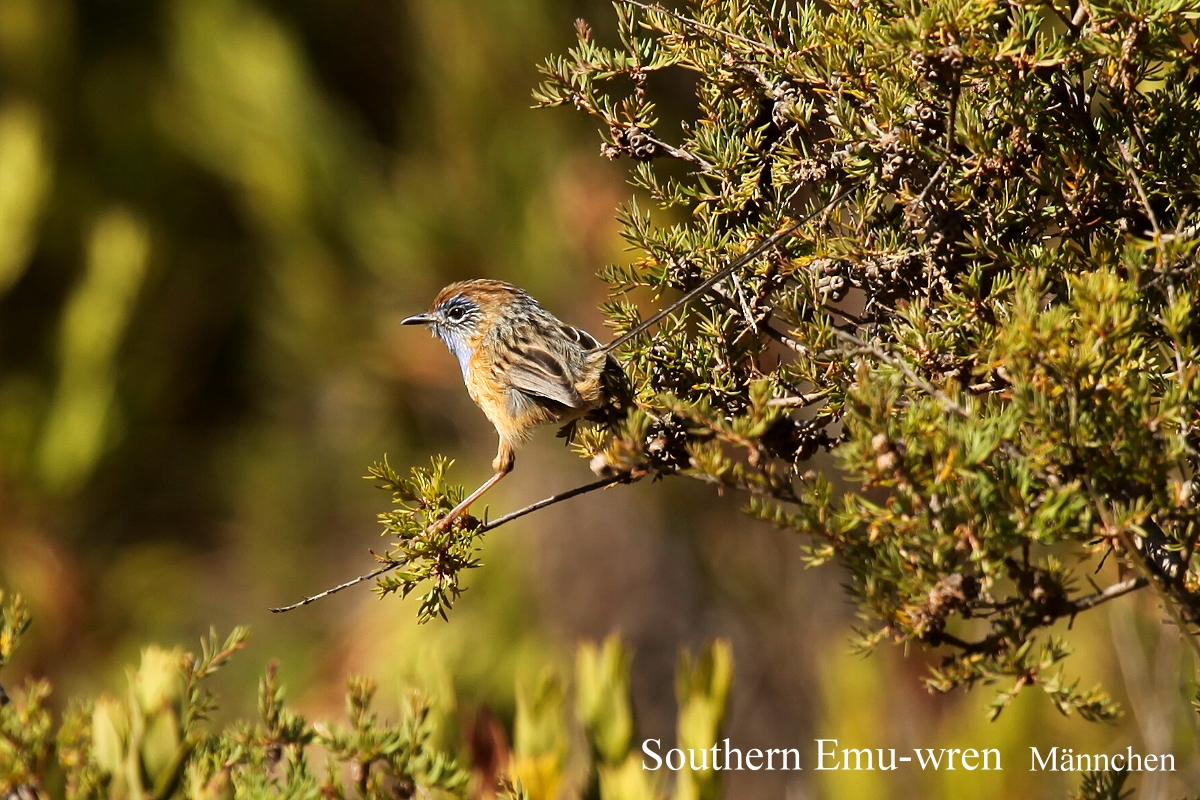 Als ich am Auto ankam, war Tomoko nicht da. Ich vermutete, dass sie wieder den Weg von heute morgen hochgegangen war und ging in diese Richtung. Nach kurzer Zeit kam sie mir überglücklich entgegen. Es war ihr gelungen, den schon lange von ihr gesuchten Southern Emu-wren zu finden, und zwar sowohl ein Männchen als auch ein Weibchen. Begeistert zeigte sie mir die gemachten Fotos. |