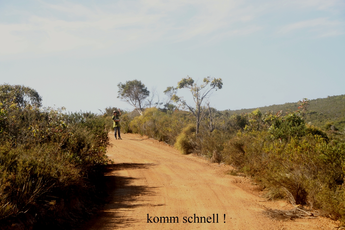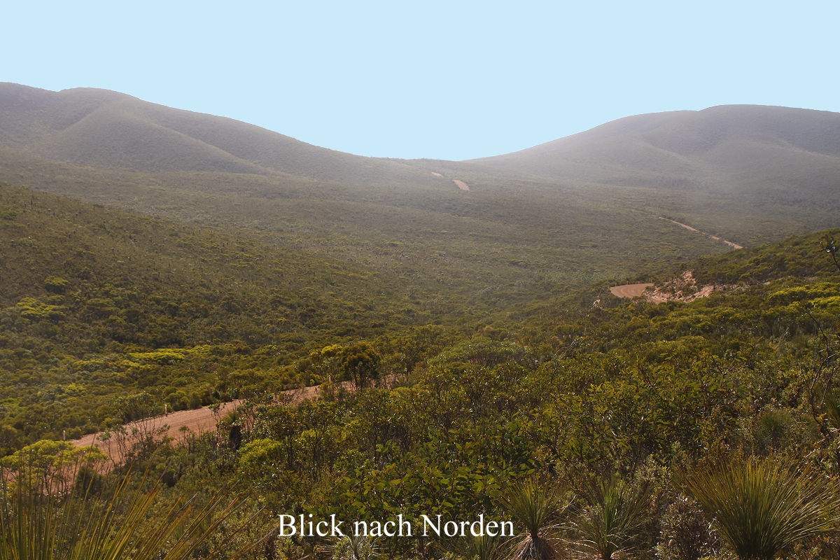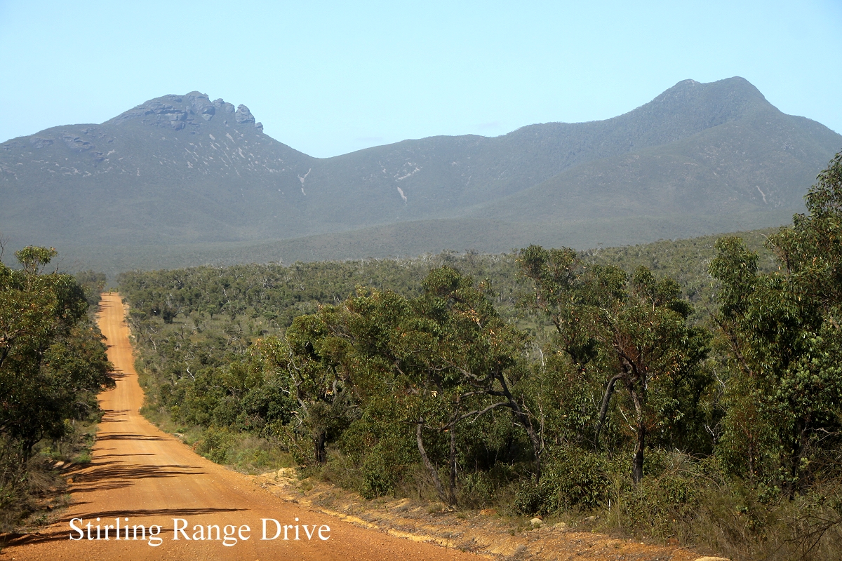 Nach ca. 10 km erreichten wir die Abzweigung zur Stirling Range Road, die auf einer Länge von 42 km den gesamten Nationalpark von Osten nach Westen durchquert. Am frühen Morgen fährt man diese unbefestigte Schotterstraße am besten in der Richtung, wie wir es taten, so dass man die noch tiefstehende Sonne im Rücken hat. Die Piste führt durch ziemlich hügeliges einsames Gelände. Kein Auto begegnete uns und weit und breit war kein Mensch zu sehen. Leider galt das auch für die Tierwelt. Außer einem Waran, der sich schnell in die Büsche davonmachte, war kein Tier zu sehen. |