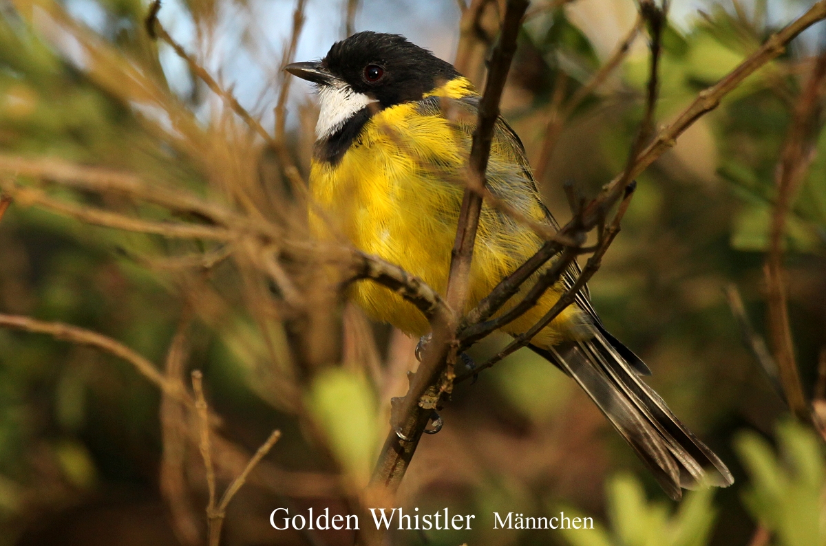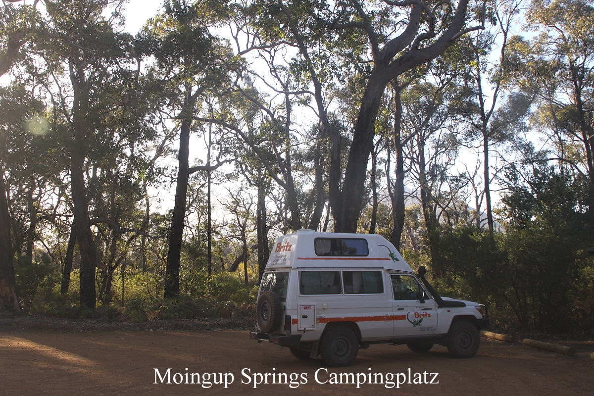 Unterwegs sahen wir zahlreiche Tauben (Common Bronzewing) am Straßenrand. Die Sonne näherte sich schon den Bergspitzen im Westen und tauchte die gesamte Landschaft in ein warmes Spätnachmittagslicht. Doch es war bemerkenswert still hier. Nur ein einziges Vögelchen schimpfte ununterbrochen im dichten Gestrüpp, wir konnten es aber nicht erkennen. Ein Hinweisschild warnte vor möglichen Dieben hier an dieser einsamen Stelle, so dass wir uns nicht lange aufhielten und um 17.30 h die 4 km unbefestigte Straße wieder zurückfuhren bis zur Hauptstraße und dort noch einen km weiterfuhren bis zum Campingplatz Moingup Springs. Was uns hier erwartete war schier unglaublich. An allen Ecken und Enden flatterten Vögel umher, so dass wir gar nicht wussten, wohin zuerst zu schauen. Die Liste der beobachteten Vögel ist lang: Grey Fantail (alt und jung), Scarlet Robin, Golden Whistler (Männchen und Weibchen), ein ganzer Schwarm junger Red-capped Parrots, Red Wattlebird, New Holland Honeyeater, ein großer Schwarm Short-billed Black-Cockatoos, mehrere Splendid Fairy Wrens (darunter auch wieder ein blaues Männchen im sich schon etwas mausernden blauen Prachtkleid), Western Gerygone, Common Bronzewing, Kookaburra. |