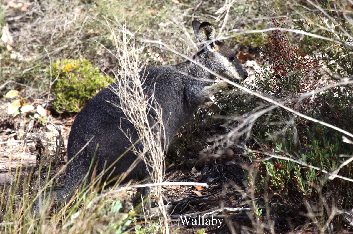 Es fegte uns ein kalter Wind entgegen, der uns bald wieder zum Auto zurücktrieb. Weiter ging es über die kurvenreiche Strecke. Hinter einer Biegung, Tomoko war inzwischen eingeschlafen, plötzlich 3 Western Brush Wallabys mitten auf dem Weg im roten Sand sitzend. Als wir uns langsam näherten, machten sie schnell ein paar Sprünge beiseite, blieben aber am Rand im Gebüsch hocken, so dass wir ein paar Fotos machen konnten. |