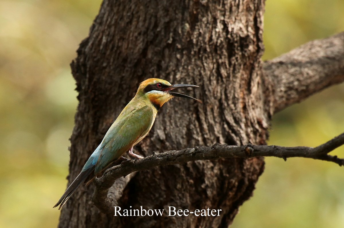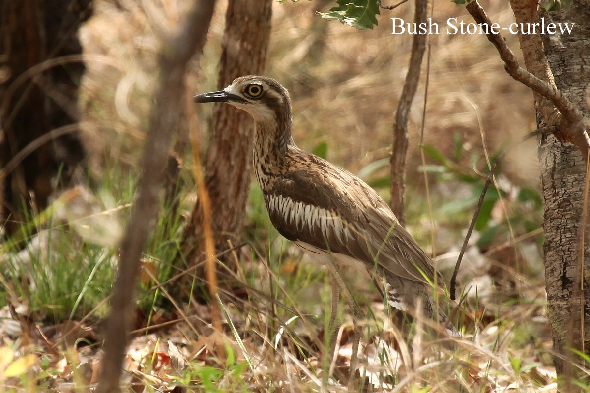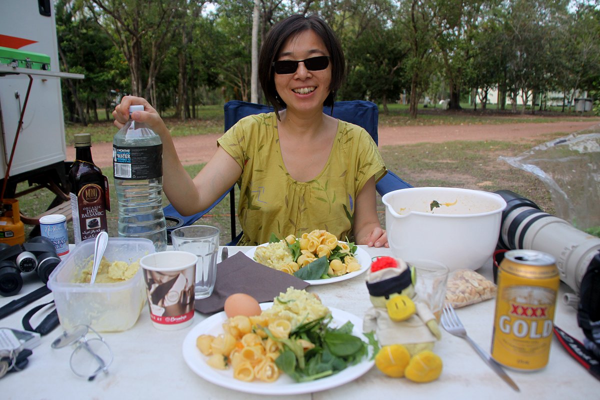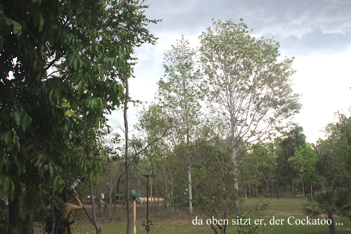 Es war schon wieder ziemlich warm draußen. Nach dem Frühstück gingen wir zur Rezeption und verlängerten unseren Aufenthalt um eine Nacht. Nachdem einige andere Gäste abgereist waren, waren wir ganz alleine auf dem Platz. Wir machten eine kleine Runde mit Fotoapparat und Fernglas. Dabei sahen wir zunächst in etwa 30 m Entfernung am Boden 3 ziemlich große Vögel (Bush Stone Curlew), die zunächst regungslos verharrten, dann aber ruhig weiterzogen. Des weiteren sahen wir 2 schöne Bienenfresser (Rainbow Bee-eater), die immer wieder ihren Ast in einem Baum verließen und kurz darauf mit einem Insekt im Schnabel zurückkehrten. Einen solchen Bienenfresser hatten wir auch schon heute Morgen beim Frühstück gesehen. Auch einige Dusky Honeyeaters flogen trotz der Hitze immer wieder hin und her.
