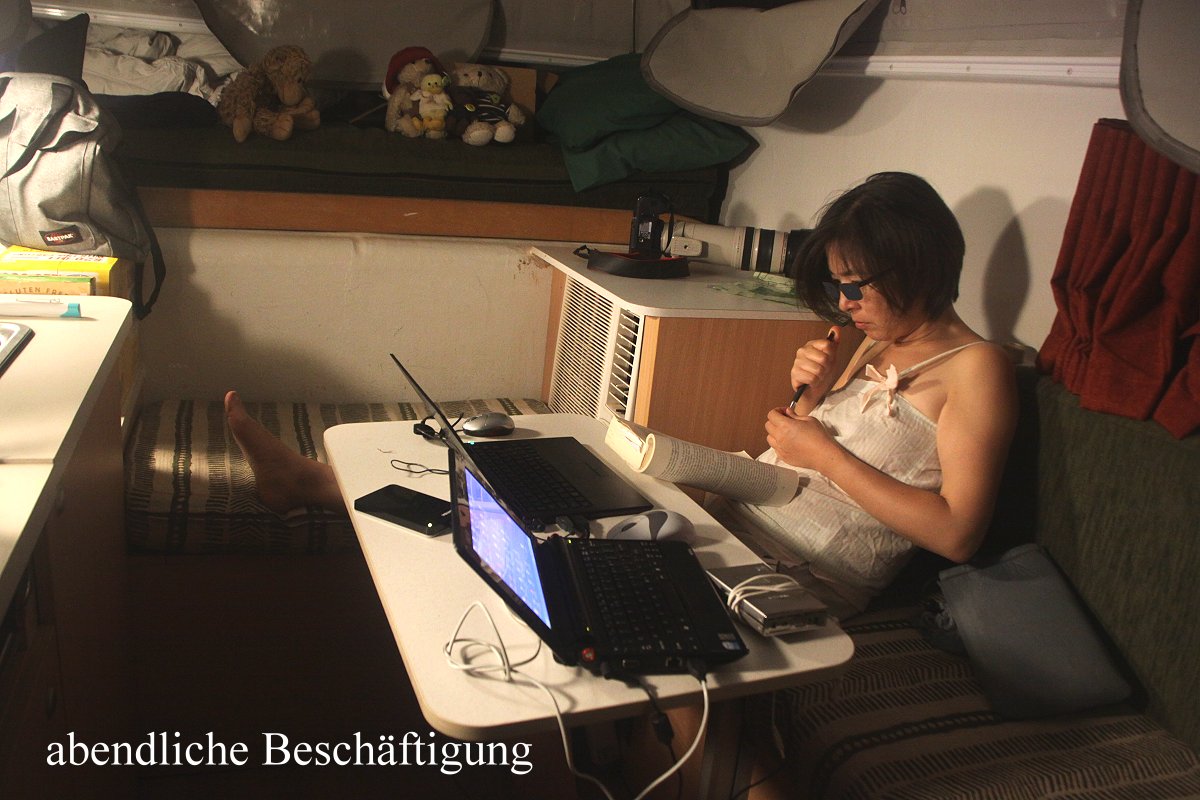 Wir spülten wie immer das Geschirr. Anschließend duschten wir ausgiebig. Dabei musste ich feststellen, dass ich von der Sonne ganz schön verbrannt war, hoffentlich wird das diese Nacht nicht zum Problem… Zurück im kühlen Auto schrieb ich mein Tagebuch fertig, Tomoko arbeitete wie immer an ihrer Übersetzung. Wir warfen auch noch einen Blick auf die Fotos und gingen dann kurz nach 22.00 h schlafen