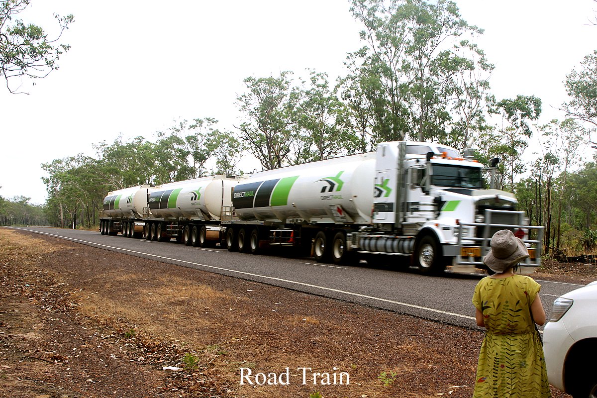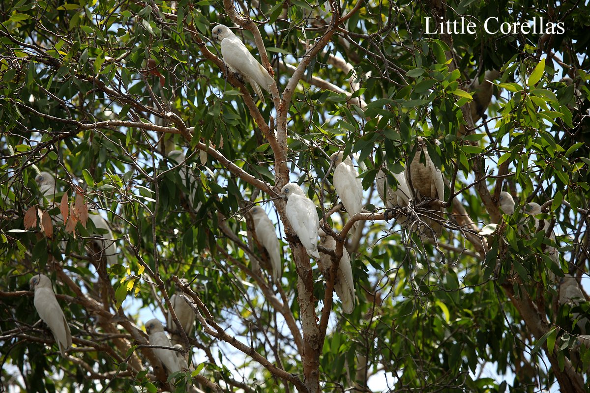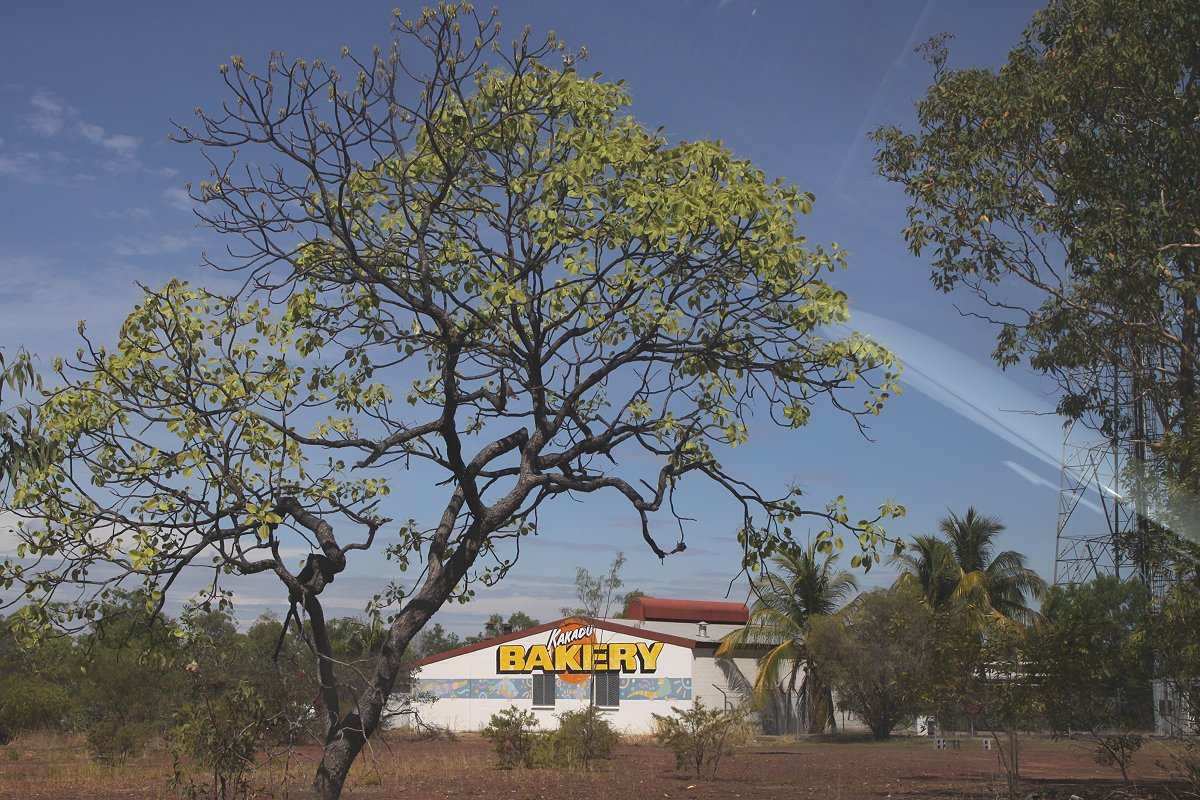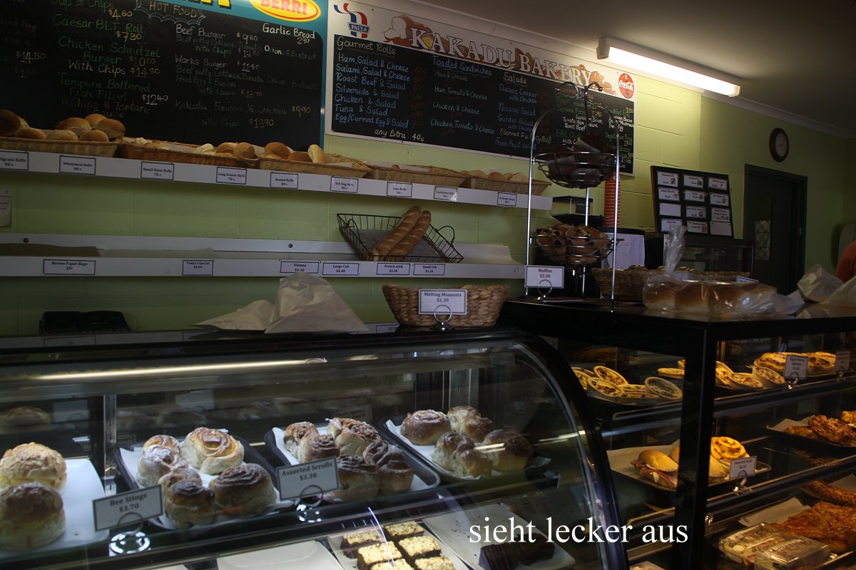 Irgendwann mussten wir aber weiter. Hinter dem Hide versteckten sich zahlreiche Little Corellas vor der unbarmherzigen Hitze im dichten Laub einiger Baumkronen. Wir waren auch froh, als wir unser klimatisiertes Auto wieder erreicht hatten. Weiter ging es Richtung Osten. Gegen 14.30 h erreichten wir Jabiru. Die im Internet empfohlene Bäckerei war schon von weitem durch einen riesigen Schriftzug zu erkennen. Hier kauften wir frisches Brot, einen ganzen Carrot Cake für die nächsten Tage, sowie zwei Stück Kuchen für den Nachmittagskaffee.
