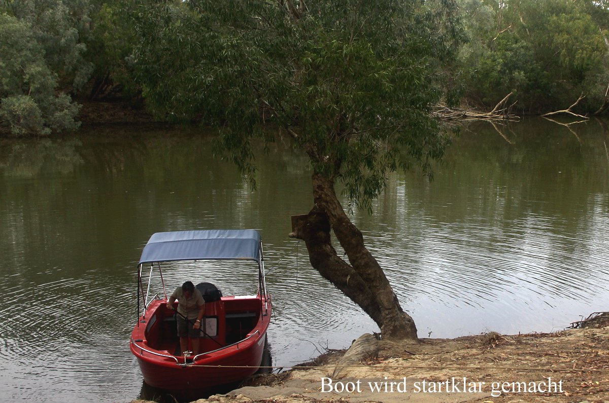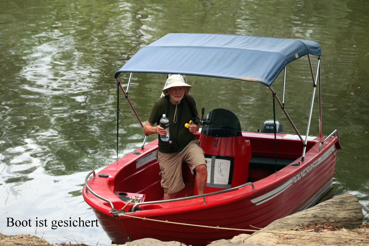 Wie immer wurden wir um 6.30 h wach. Das Wetter war etwas bewölkt, aber es war draußen immer noch 26° warm. Wir hatten diese Nacht ohne Klimaanlage gut geschlafen. Wir machten uns fertig für die heutige Bootsfahrt auf dem Mary River. Etliche Wallabys waren schon unterwegs. Kurz vor der vereinbarten Zeit 7.30 h erschien die freundliche Angestellte und machte das Boot startklar. Ausführlich erklärte sie uns die Bedienung, sowie einige Besonderheiten des Flusses, der an einigen Stellen über nicht sichtbare Felsen und Sandbänke träge dahinfließt. Voller Erwartung fuhren wir stromaufwärts. In dem Bambushain in der Nähe hingen wieder zahlreiche fliegende Füchse mit dem Kopf nach unten.