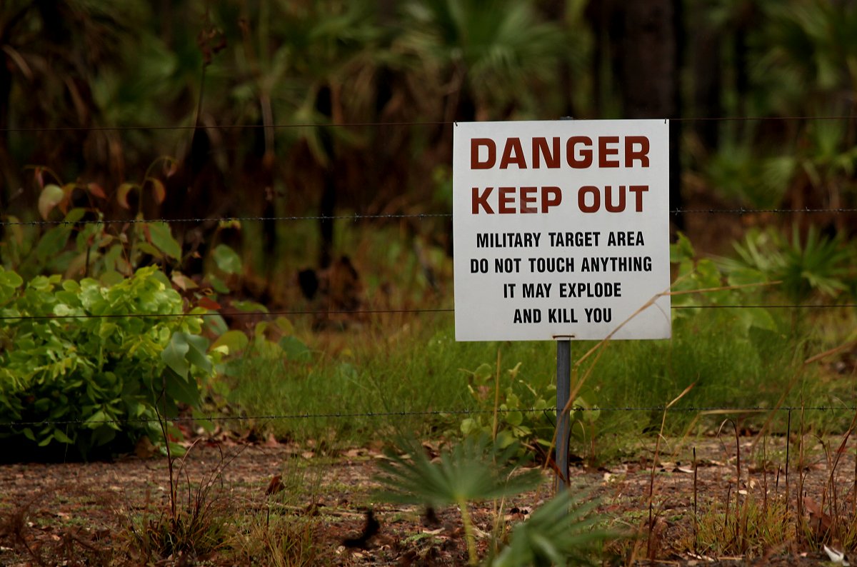 Ich brachte den Zündschlüssel zur Rezeption zurück. Tomoko hatte inzwischen mit den Vorbereitungen zum Frühstück begonnen. Wir hatten beide heute mächtig Hunger, Tomoko aß 3 Scheiben Toast und ich 5 !!! Nach dem Duschen packten wir alles zusammen und waren gegen 11.15 h startbereit. Weiter ging es auf dem Arnhem Highway nach Osten Richtung Kakadu Nationalpark. Nach einer halben Stunde sahen wir etliche schwarze Papageien die Straße überfliegen und in der Nähe auf einem Baum landen. Es waren Red-tailed Black-Cockatoos, die leider etwas zu weit saßen für ein gutes Foto. Weiter konnte man auch nicht gehen, da ein Zaun mit einem Schild "Militärisches Sperrgebiet" ein Weitergehen verbot.