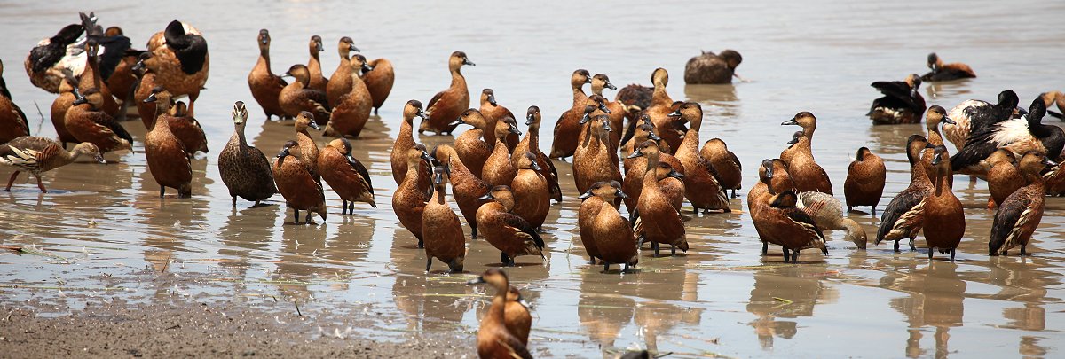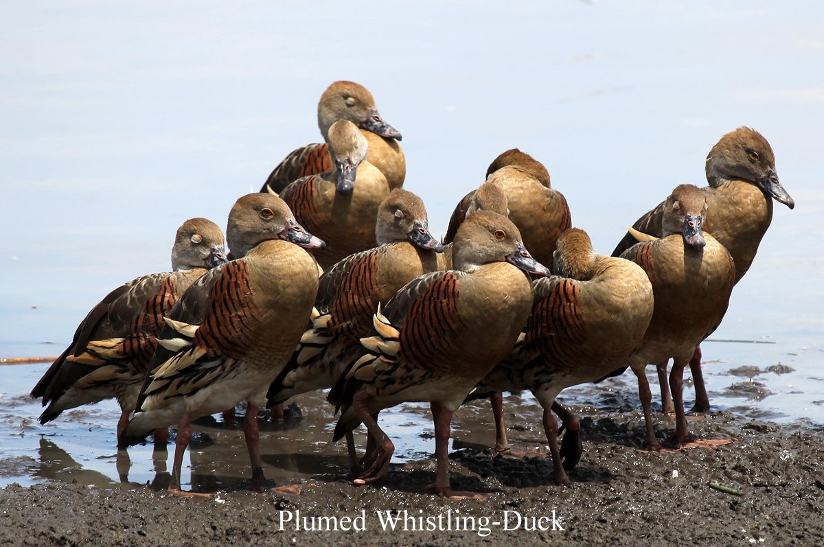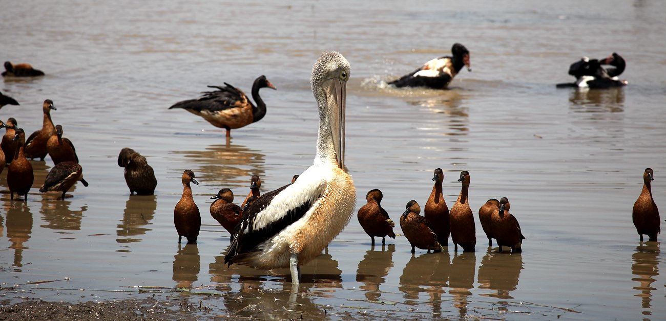 Abwechselnd schauten wir durchs Fernglas oder machten Fotos. Man kann den Eindruck mit Worten nicht beschreiben. Ein Löffler durchpflügte unaufhörlich den Untergrund nach Nahrung suchend. Des weiteren sahen wir noch: Plumed Whistling-Duck, Wandering Whistling-Duck, Glossy Ibis, Magpie Goose, Pied Heron, Black-winged Stilt, Red-kneed Dotterel, Radjah Shelduck, Australian Pelican, Comb-crested Jacana und weitere Wasservögel.