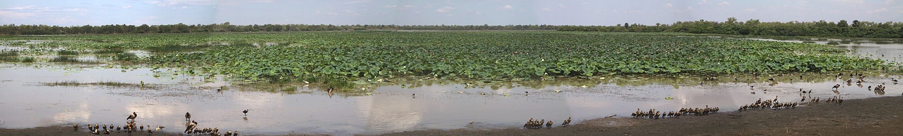 Einige km weiter tauchten nochmals 2 Red-tailed Black-Cockatoos auf einem Baum direkt neben der Straße auf, die wir deutlich besser beobachten konnten. Kurz darauf erreichten wir die Grenze zum Kakadu NP. Am Aurora Kakadu Hotel hielten wir kurz und kauften zwei Eintrittspässe für den Park, je 25,- $, gültig für 14 Tage. Da ich etwas müde war von der Hitze, kaufte ich mir einen Cappuccino an einer Kaffeemaschine für 3,50 $, der aber nicht besonders gut schmeckte. Weiter ging es bis auf einmal ein Schild vor einer Abzweigung zum Mamukala Lookout auftauchte. Tomoko fühlte sich fit, so dass wir den 1 km langen Abstecher machten. Was uns erwartete war unbeschreiblich. Auf dem 100 m langen Weg vom Parkplatz hörten wir schon ein unbeschreibliches Konzert von verschiedenen Vogelstimmen, das uns die Hitze vergessen ließ. Am Hide angekommen waren wir sprachlos. Tausende von Wasservögel bevölkerten die von blühenden Lotusblumen bewachsene vor uns liegende endlose Fläche.