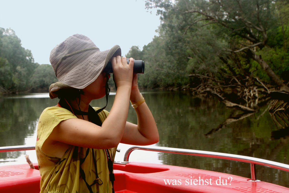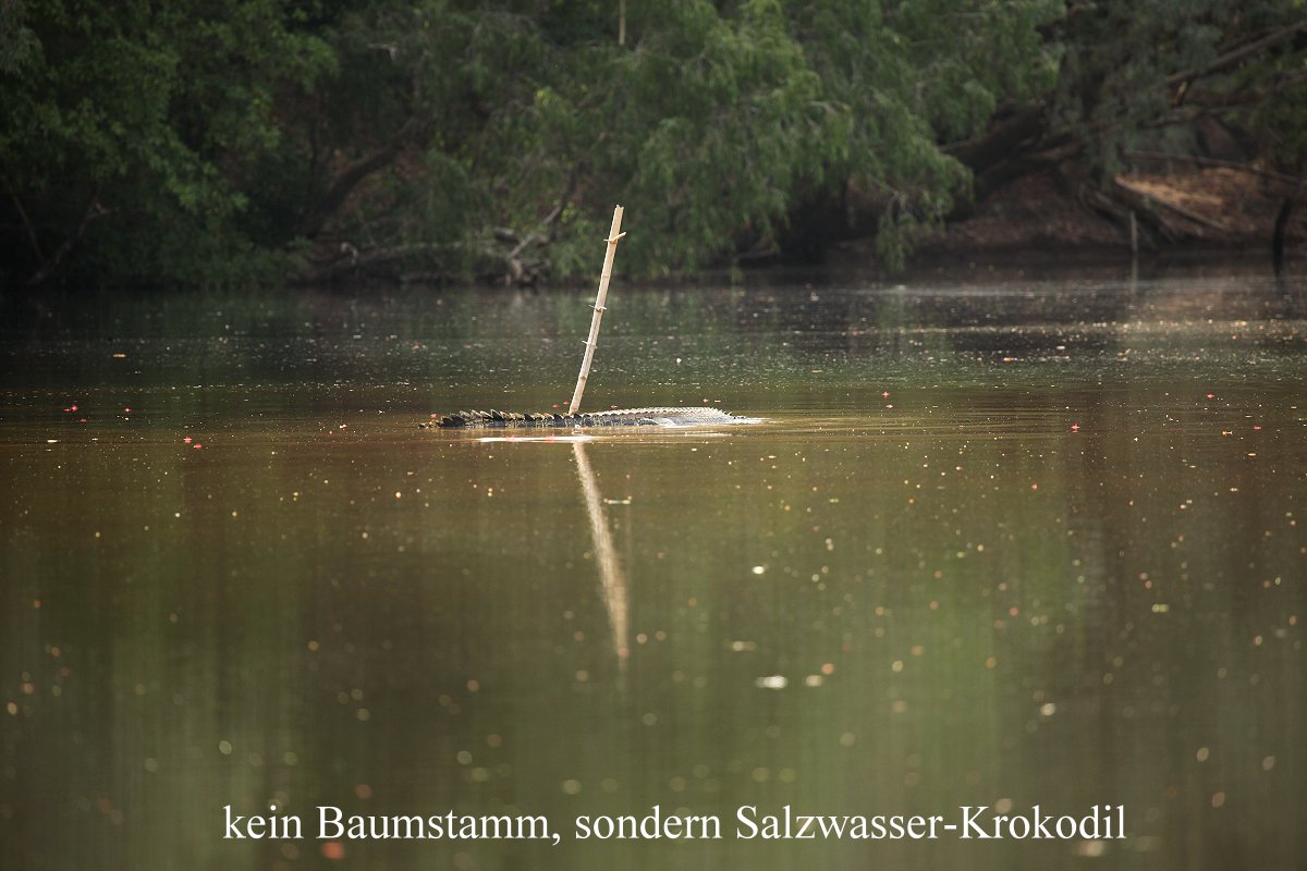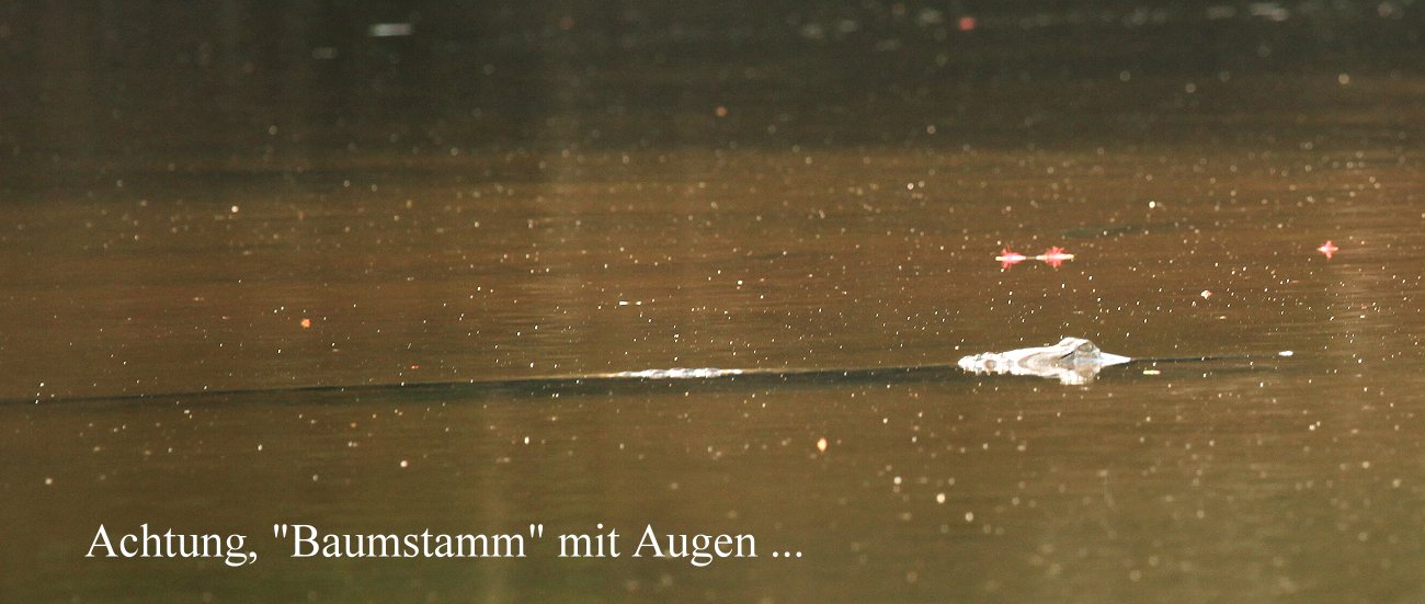 Um 8.50 h erreichten wir das durch einen weißen Plastikkanister gekennzeichnete Ende der befahrbaren Strecke. Ich wendete das Boot und wir fuhren die gleiche Strecke wieder zurück. Kurz vorher hatte ich voraus einen großen grauen Felsen entdeckt. Als wir näher kamen, tauchte der Felsen schnell unter die Wasseroberfläche, es war ein ziemlich großes Salzwasser-Krokodil…