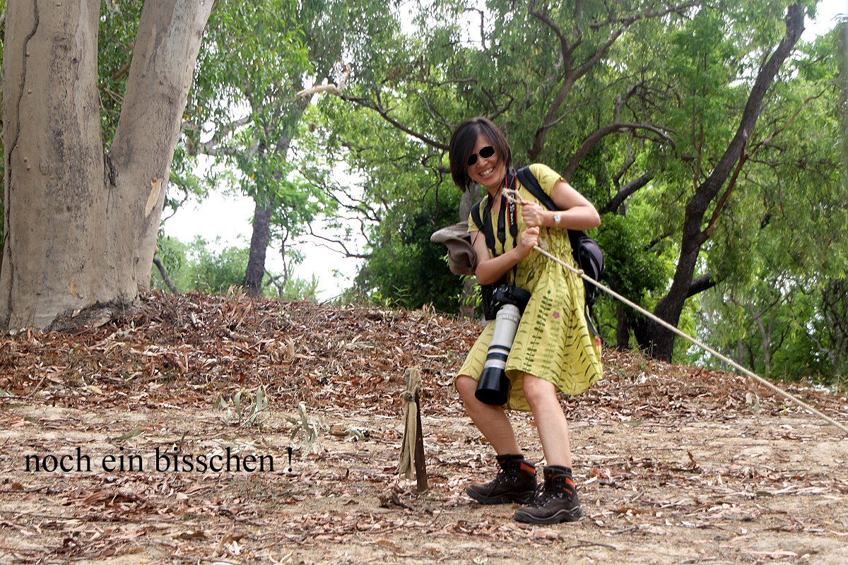 Leider war die Kaffeemaschine defekt, so dass wir den benötigten Kaffee in einem anderen kleinen Laden kauften und zusammen mit dem Kuchen im kühlen Auto verzehrten. Im benachbarten Supermarkt kauften wir noch Wasser sowie eine neue Pfanne, da die im Auto-Zubehör enthaltene ihren Griff zu verlieren droht. Wir verließen Jabiru auf dem Kakadu Highway Richtung Süden, machten aber am Ausgang noch einen kurzen Stopp im Visitor-Center, wo wir einiges Interessante über den Park und seine Besitzer, die Aborigines, erfuhren. Weiter ging die Fahrt Richtung Cooinda, 54 km weiter, wo wir übernachten wollten. Ein erster kräftiger Regenschauer ging hernieder. Nach insgesamt 200 km kamen wir um 17.00 h bei der Gogudju-Lodge in Cooinda an. Für 41,- $ pro Nacht buchten wir 2 Nächte auf dem dortigen Caravan-Park. Als wir zum Auto zurückgingen, regnete es heftig. Nach kurzer Zeit hörte der Regen aber wieder auf, so dass wir im Trockenen unser Abendessen einnehmen konnten. Heute bereitete Tomoko eine schmackhafte kalte Pasta mit viel Knoblauch, Tomaten und Avocado zu, die wir uns mit einem kühlen Bier schmecken ließen. Fernes Wetterleuchten und vereinzelte Blitze deuteten auf ein kommendes Gewitter hin, aber noch war das weit entfernt. Nach dem obligatorischen Spülen zogen wir uns ins Auto zurück. Ich schrieb den heute besonders langen Tagesbericht, Tomoko beschäftigte sich mit ihren heute gemachten über 400 Fotos. Unterdessen fing es plötzlich wieder an zu regnen, auch Donner war hin und wieder zu hören. Im geräumigen Auto machte uns das jedoch nichts aus. Mal sehen wie das Wetter morgen wird…
