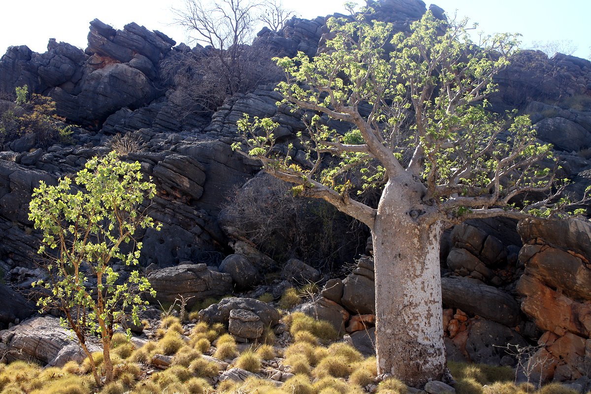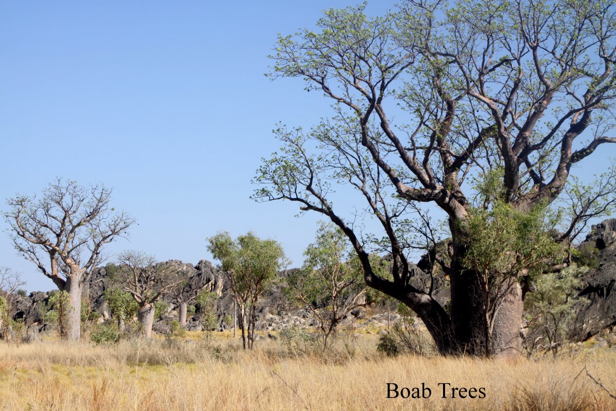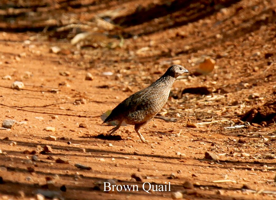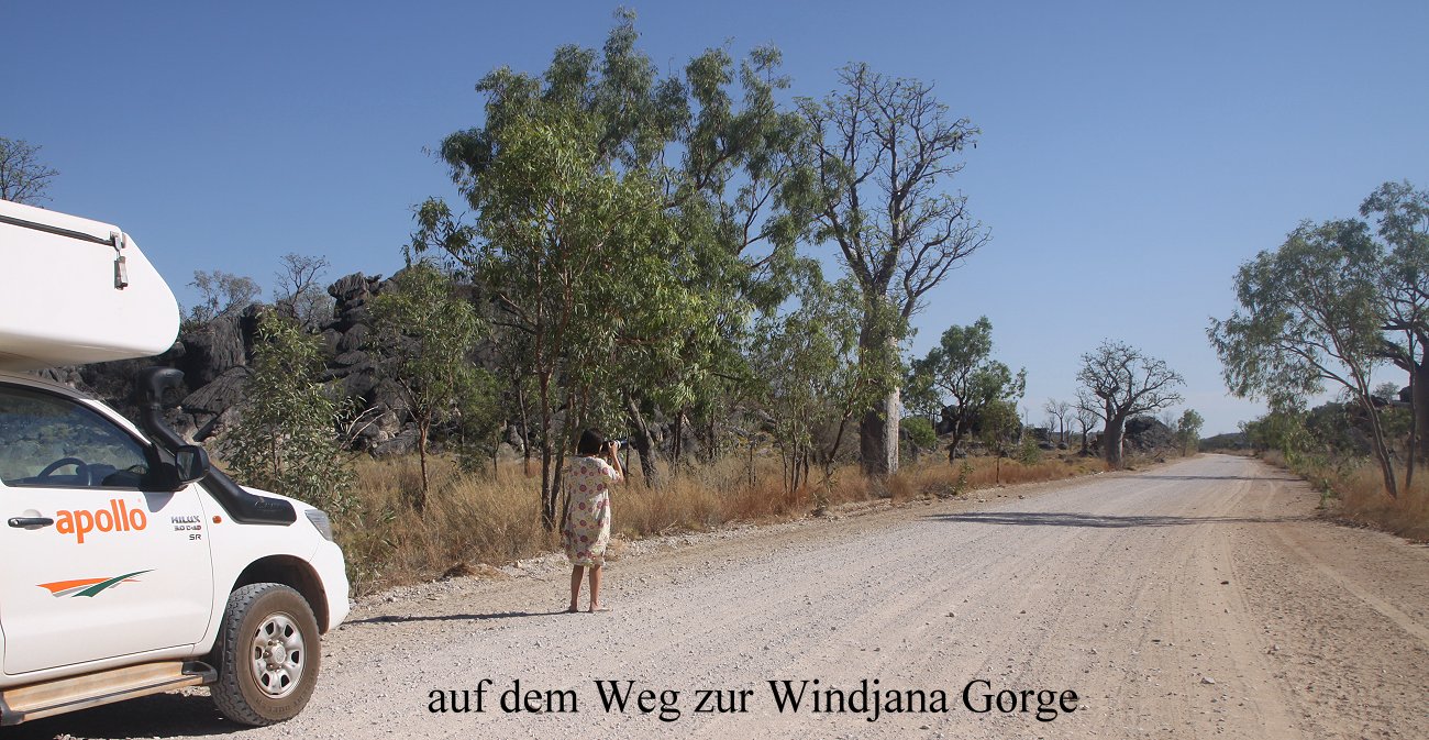Nach einem herzlichen Abschied von unseren holländischen Nachbarn fuhren wir Punkt 7.00 h los Richtung Windjana Gorge. Zunächst ging es 45 km auf dem Northern Highway Richtung Derby. Dort zweigten wir ab auf eine unbefestigte Straße (Leopold Road) Richtung Windjana Gorge. Die Piste war zwar teilweise etwas holprig, aber dennoch ganz gut zu befahren. Viele Boab-Bäume säumten die Strecke. Nach ein paar km kreuzten plötzlich 4-5 kleine Hühner (Brown Quail) einer nach dem anderen unseren Weg, aber verschwanden schnell wieder im hohen dichten trockenen Gras. |
