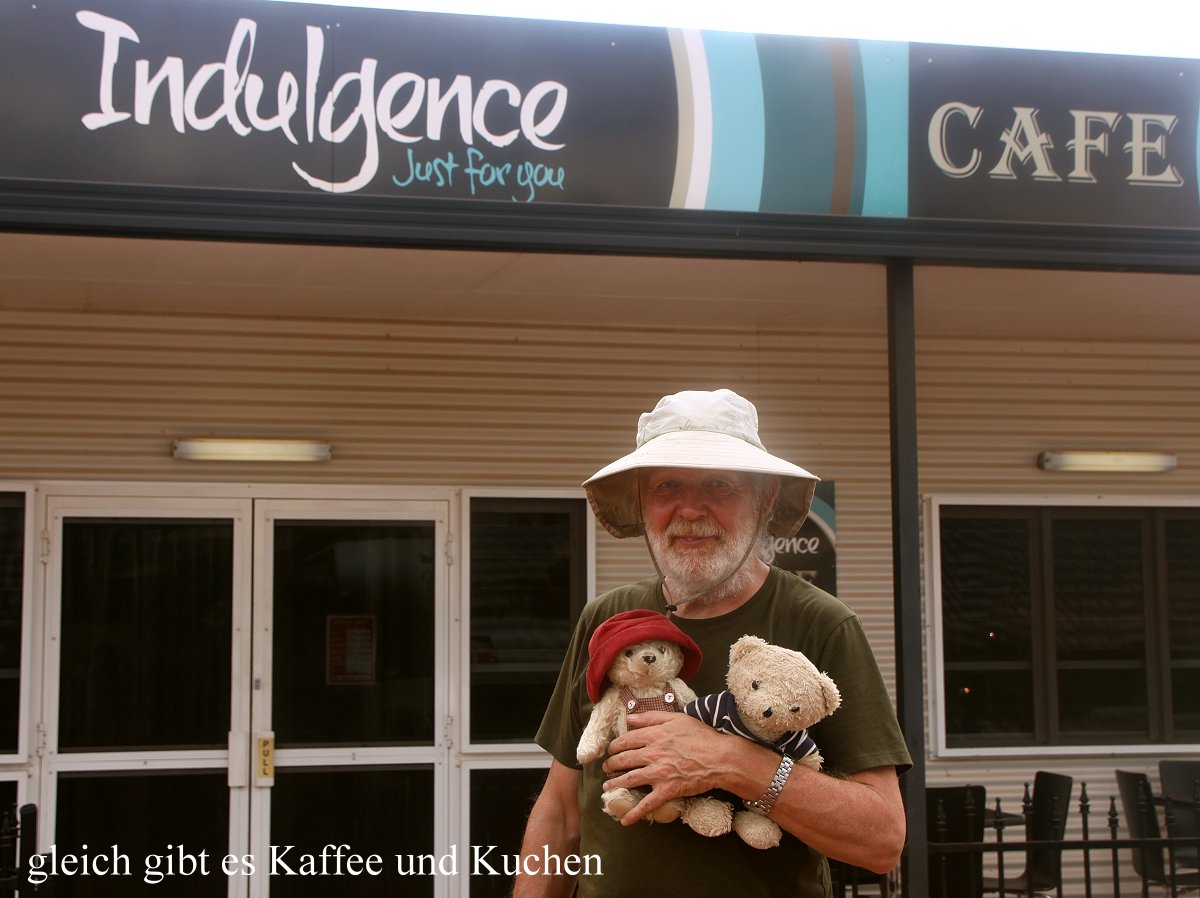 Um 12.50 h erreichten wir nach insgesamt 295 km Derby. Gleich am Ortseingang fanden wir einen Supermarkt (Woolworths), wo wir unsere Essensvorräte ergänzten. Etwas weiter befindet sich das Visitor-Center, das wir kurz besuchten. Hier erhielten wir einige interessante Informationen über die Straßenzustände sowie über Schließungen von einzelnen Gebieten. Besonders interessant für uns war zu erfahren, dass auf der Gibb River Road schon viele Einrichtungen wegen Saisonende geschlossen waren. Gut, dass wir diese Strecke nicht gefahren sind. Die nette Dame im Visitor-Center wies uns noch den Weg zu einem netten Café, wo wir gleich mal hinfuhren. Es gab leckeren Kuchen und schmackhaften Cappuccino, was wir unseren Bären nach der Rüttelstrecke vorhin versprochen hatten. Alle waren zufrieden. |