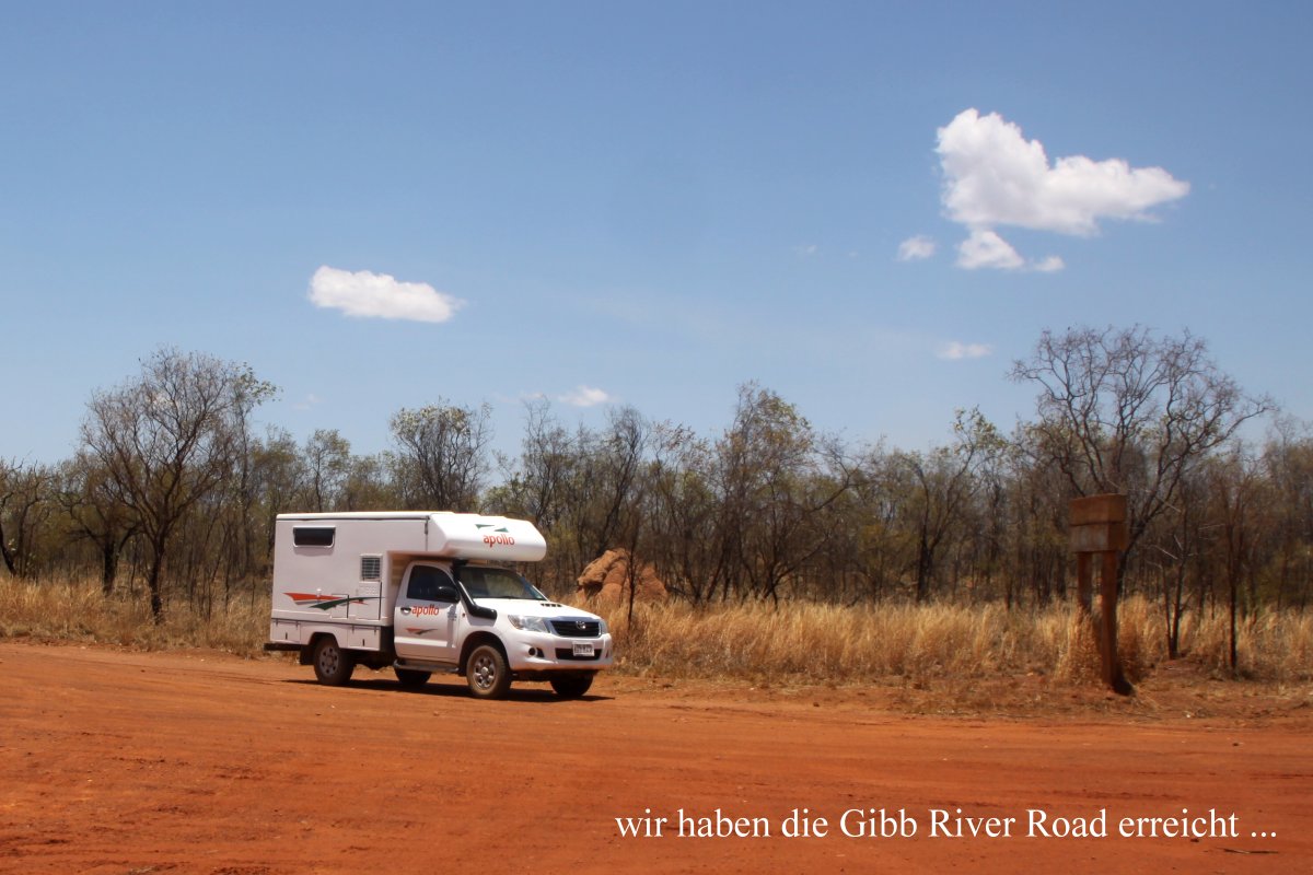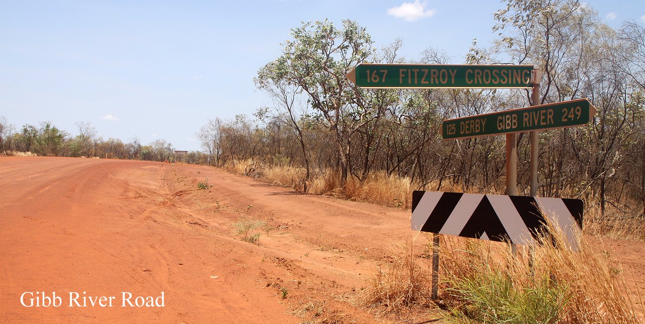 Weiter ging es Richtung Derby. Nach 15 km erreichten wir die Gibb River Road, die wir ja eigentlich ursprünglich ganz fahren wollten. Von hier waren es noch 125 km bis Derby. Auf der ganzen Strecke bisher waren uns höchstens 5 oder 6 Autos begegnet und jetzt war überhaupt kein Verkehr mehr zu sehen. Zunächst war die Straße noch unbefestigt, nur die letzten 70 km bis Derby sind durchgehend asphaltiert. Ich war froh, dass wir die Strecke ohne Probleme mit unseren doch etwas abgefahrenen Reifen bewältigt hatten. Einen Reifenwechsel bei diesen Temperaturen wollte ich nun doch nicht unbedingt riskieren. |