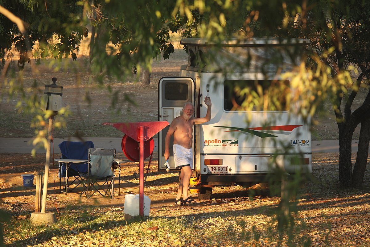 Wie immer wurden wir gegen 5.00 h wach. Heute ließen wir es etwas langsamer angehen. Aus dem Bett beobachteten wir einige Wallabys in der Nähe. Auch die ersten Vögel waren schon am Wasserhahn beschäftigt, die austretenden Tropfen aufzufangen. Wir machten Frühstück. Um 6.30 h waren wir damit fertig und begannen einzupacken. Es war schon wieder 29°, die Sonne zwar noch hinter den Bäumen versteckt, aber man merkte schon ihre Strahlung. Einige Wallabys lagen faul im Schatten. Bei der Toilette nisteten zahlreiche Schwalben (Fairy Martin). |