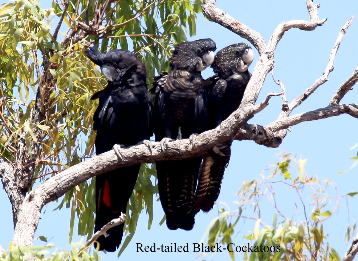 Um 9.15 h erreichten wir den Parkplatz beim Tunnel Creek. Die Besonderheit beim Tunnel Creek – einem Nebenbach des Lennard River, der die Windjana-Schlucht hervorgebracht hat – ist sein unterirdischer Verlauf auf einer Strecke von ca. 750 m. Dieser Tunnel ist das Erosionswerk des kleinen Baches, der über die Jahrtausende eine 9–15 m breite Höhle entstehen ließ, indem er den Kalk löste. Durch feine Ritzen ist das Wasser in das Gestein eingedrungen und hat die Hohlräume gebildet. (Wikipedia). Ein einzelnes Auto stand dort, dessen Insassen sich offensichtlich auf den beschwerlichen Marsch in die Höhle gemacht hatten. Bei 40° im Schatten verzichteten wir lieber darauf und fuhren weiter. Etwas weiter entdeckten wir auf verschiedenen Bäumen rechts und links der Straße zahlreiche Red-tailed Black Cockatoos sitzen. Wir wussten gar nicht, wohin zuerst zu schauen, vor allen Dingen wenig Aufmerksamkeit zu erregen, da diese Vögel sehr scheu sind. Es gelang Tomoko aber ein paar Fotos zu machen. |