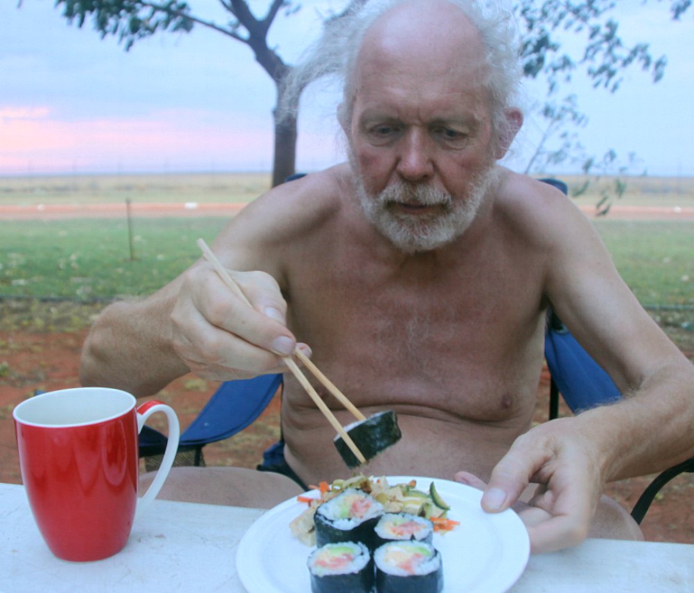 Bald darauf begann Tomoko mit den Kochvorbereitungen, während ich schon mal mit meinem Tagebuch anfing. Heute gab es japanische Sushi. Als Tomoko damit fertig war, setzten wir uns nach draußen an den Tisch. Zu den Sushis hatte Tomoko noch eine Miso-Suppe sowie einen Tofu-Salat gemacht, schmeckte alles köstlich zusammen mit einem Bier. |