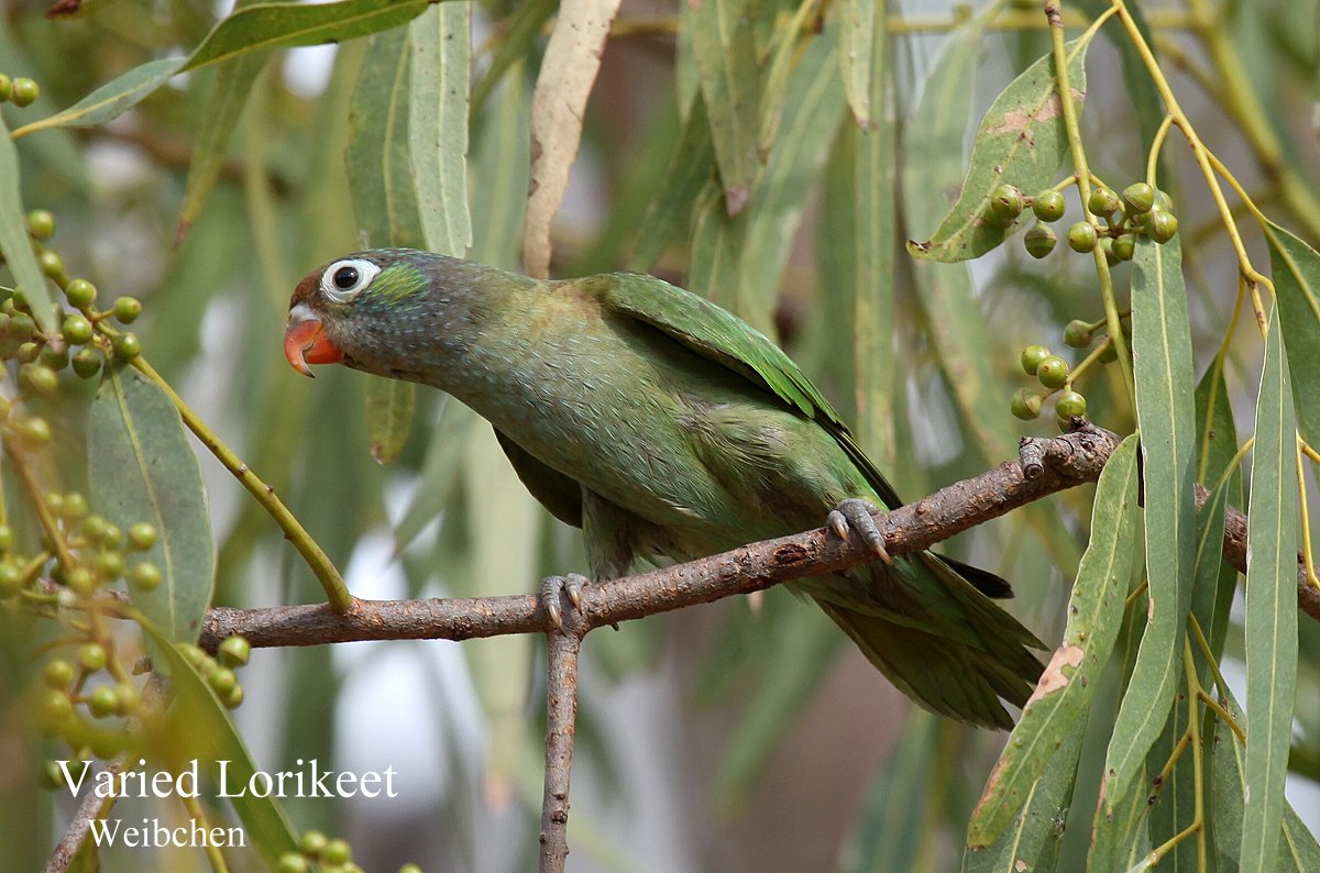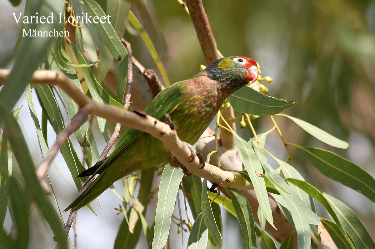 Ganz in der Nähe liegt ein Caravan-Park, wo wir von einem sehr netten Besitzer einen schönen Platz zugewiesen bekamen (34,-$) mit Blick auf das nahe Marschland. Nachdem ich wie immer alles angeschlossen hatte, stellte ich fest, dass die Klimaanlage im Wohnbereich nicht funktionierte. Gott sei Dank war es nur noch 34° warm und vom Meer her wehte eine kräftige kühlende Brise. Ich machte alle Fenster auf, so dass eine angenehme Innentemperatur entstand. Morgen in Broome werden wir bei APOLLO vorbeifahren und mal nachschauen lassen. Tomoko ging zur Toilette, kam aber schnell wieder zurück um ihren Fotoapparat zu holen. Bei den Waschräumen zwitscherten in einem hohen Baum zahlreiche Papageien (Varied Lorikeet), die ich mir auch gleich anschaute, da sie für mich ganz neu waren. |