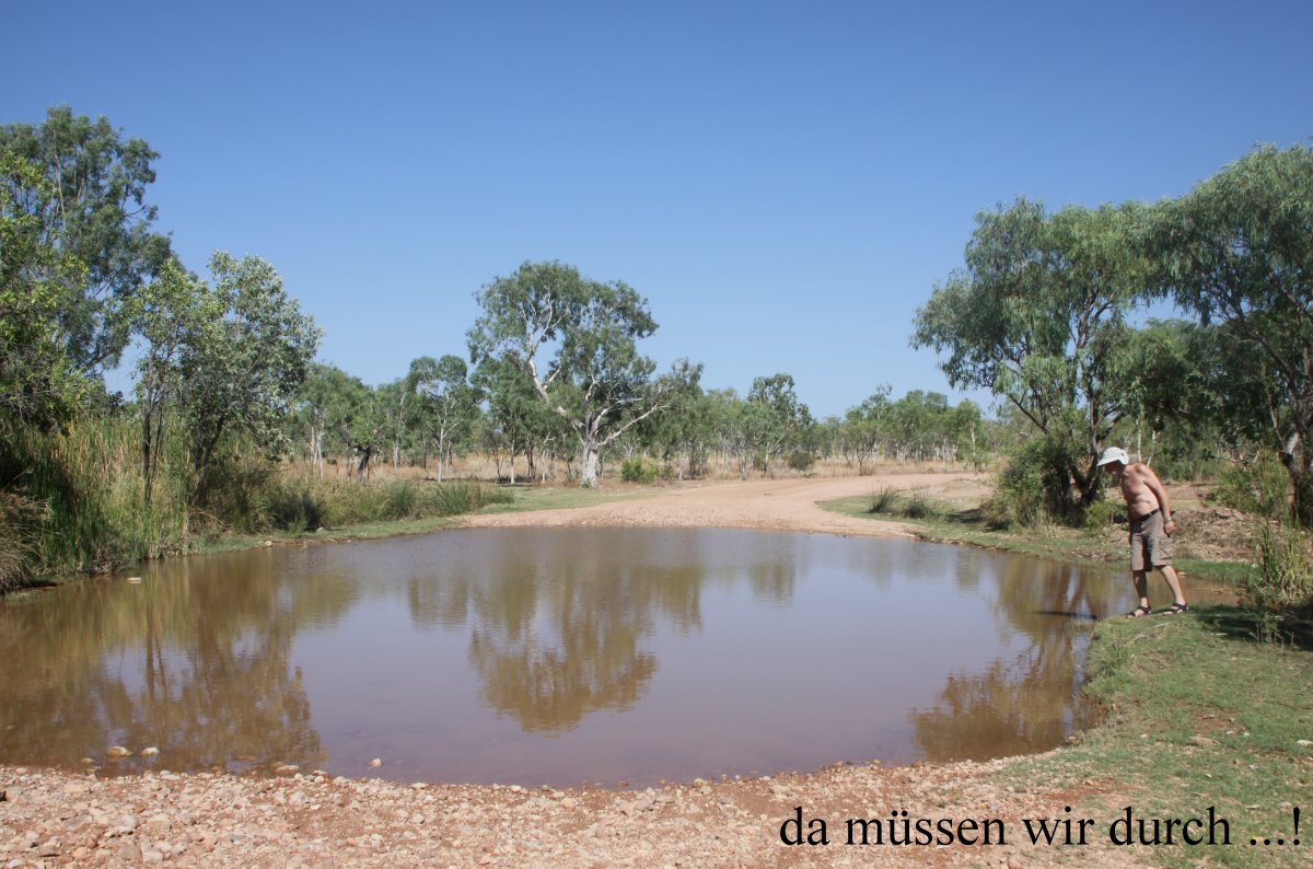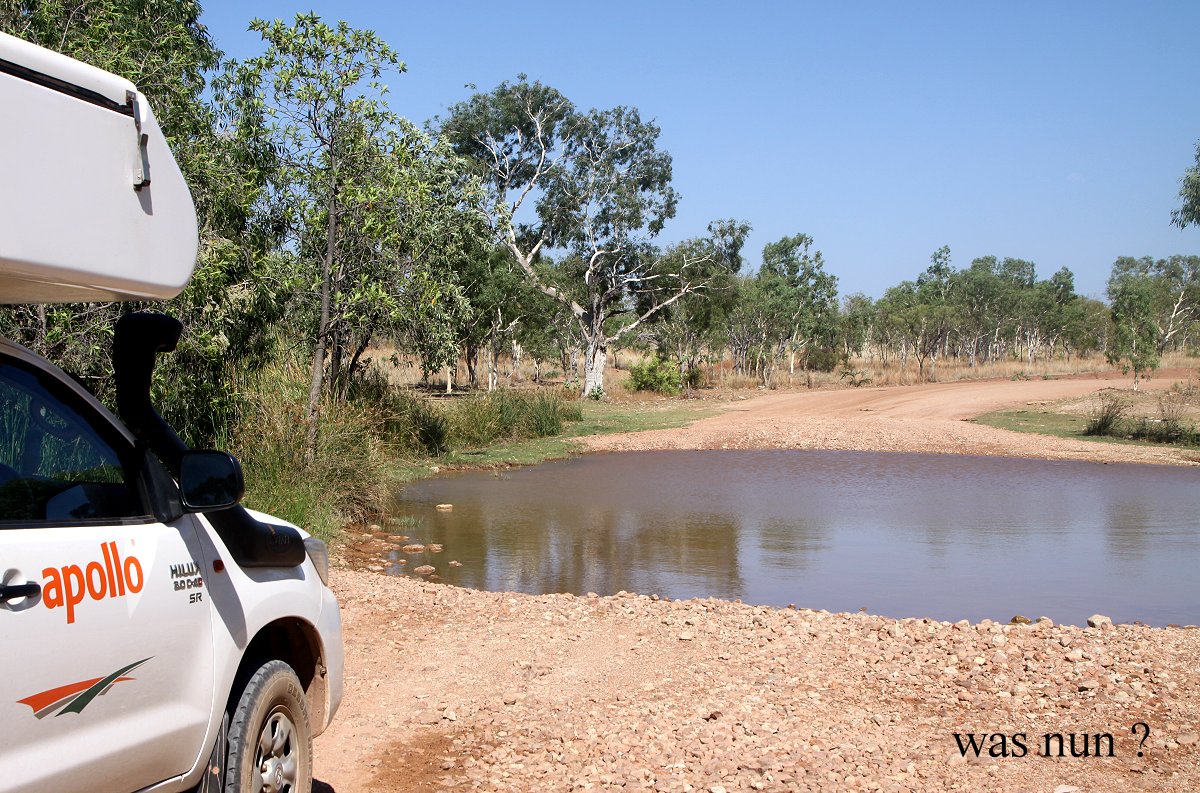 Nach einer halben Stunde Fahrt schaltete ich um auf Vierradantrieb. Danach hatte das Auto doch eine deutlich bessere Haftung auf der welligen Holperpiste. Gegen 8.30 h nach einer scharfen Kurve standen wir plötzlich vor einem Wasserloch, das wir durchqueren mussten. Ich stieg mal aus um die Wassertiefe zu prüfen. Dabei achtete ich sehr zum Ärger von Tomoko, die extra ausgestiegen war um ein Foto zu machen, nicht auf eine kleine Gruppe Red-tailed Black Cockatoos, die ganz nahe in einem Busch saßen, dann aber sofort wegflogen, als sie mich sahen. Entschuldigung Tomoko ! Das Wasser hatte eine lehmbraune Farbe, so dass ich den Wasserstand nicht genau einschätzen konnte. Da uns aber vor einer Viertelstunde ein Auto entgegen gekommen war, das diese Stelle auch passiert haben musste, wagte ich die Durchfahrt. Im 2.Gang tauchte ich ins Wasser und fuhr zügig die ca. 15 m hindurch, wobei die Räder ganz eintauchten. Schon ein komisches Gefühl… Als wir wieder festen Boden unter den Füßen hatten, stank es plötzlich ganz verbrannt im Auto. Wir wussten nicht wieso, aber nach ein paar Minuten roch man nichts mehr. |