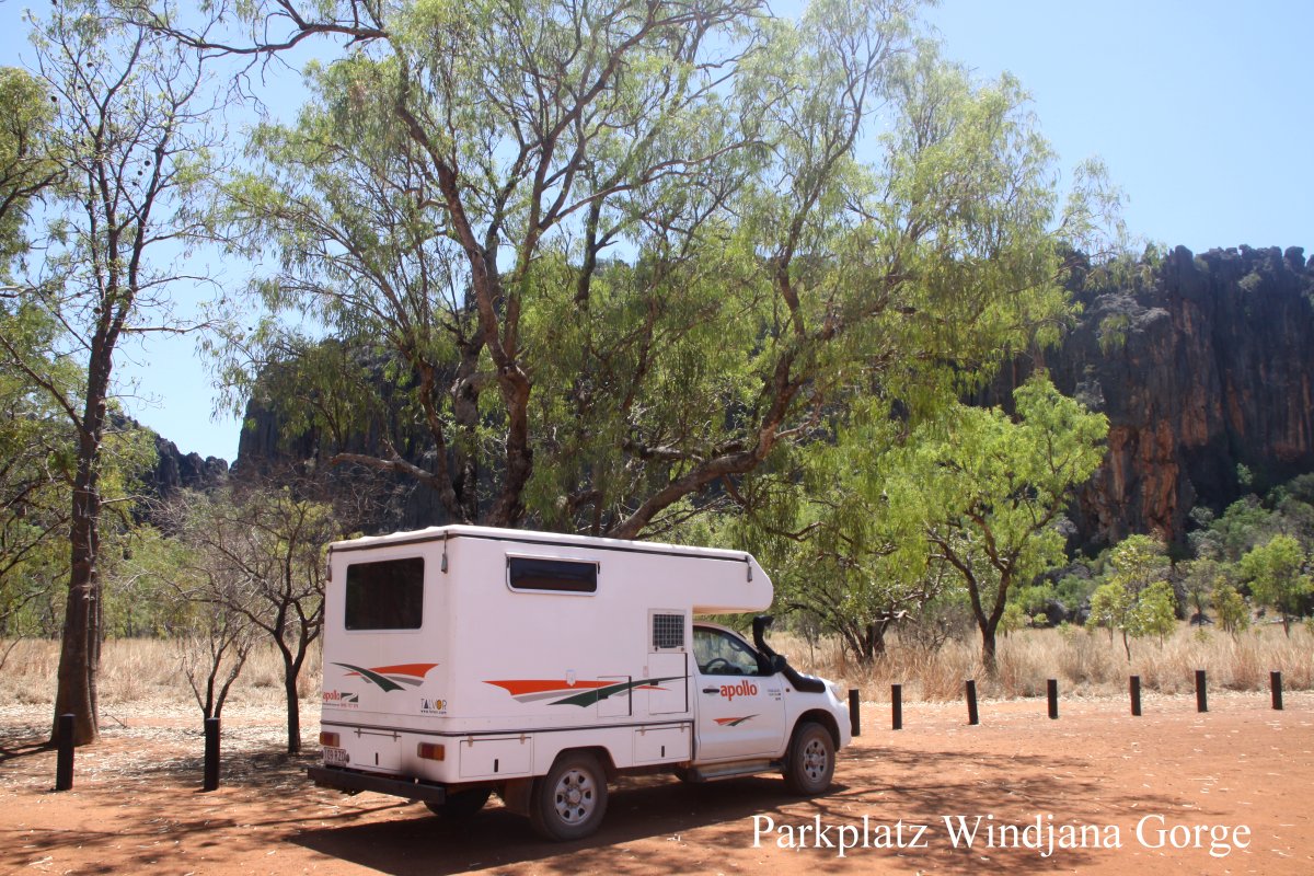 Um 10.20 h kamen wir nach genau 150 km Fahrt bei der Windjana Gorge an. Auf dem ziemlich großen Campingplatz war kein einziges Auto zu sehen. Schade, dass es mit jetzt wieder 41° zu heiß war um einen Spaziergang in die Schlucht zu machen, die sicher sehenswert ist, wie ich in zahlreichen Berichten im Internet gelesen hatte. Stattdessen aßen wir im Auto bei laufender Klimaanlage Cookies und Plätzchen und tranken Eiskaffee aus dem Kühlschrank dazu, sehr erfrischend. |