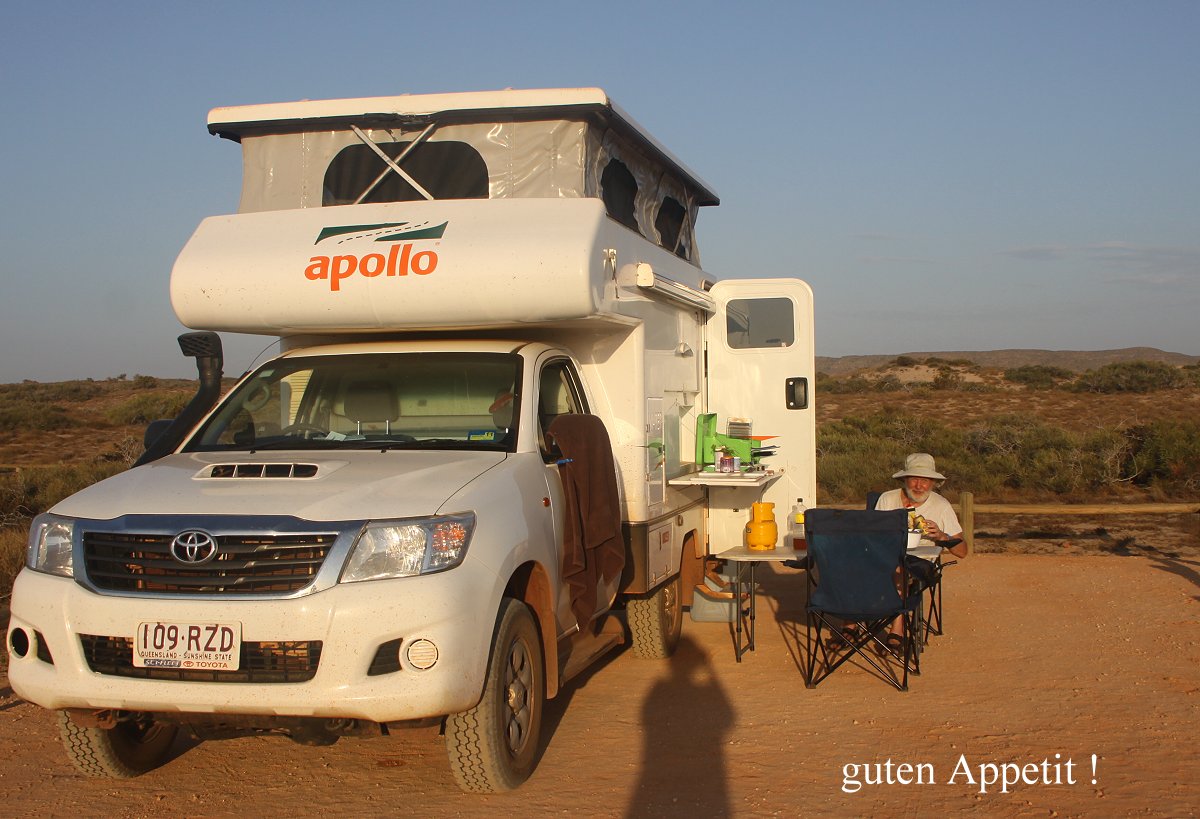 Irgendwann nach 16.00 h kam ein Auto, es war der sehnlichst erwartete Camp Host (ich nannte die übrigens "Camp Ghost", da sie nie da waren, wenn man sie brauchte). Nach freundlicher Begrüßung mussten wir feststellen, dass auch dieser Platz schon reserviert war. Die Dame war aber sehr freundlich und setzte sich per Walkie Talkie mit verschiedenen Campingplätzen in Verbindung. Auf einem Platz weiter im Süden (Kurragong) gab es noch einen freien Platz. Wir bezahlten an Ort und Stelle 15,- $ für eine Nacht und machten uns mit Quittung auf den etwa 15 minütigen Weg. Ich fuhr sehr langsam, da jetzt die Zeit gekommen war, wo die Tiere aktiver werden. Vorhin war mir trotz relativ langsamer Fahrt ein Vögelchen in die Windschutzscheibe geflogen, was uns beide sehr traurig stimmte… Am Campingplatz angekommen wurden wir freundlich vom Camp Host begrüßt. Der Platz gefiel uns besser als alle anderen, die wir vorher gesehen hatten. Wir packten unsere Campingmöbel aus und Tomoko begann bald mit Kochen. Heute gab es mexikanische Enchiladas. Dazu trank ich ein Bier, Tomoko Tee und ein Glas Wein. |