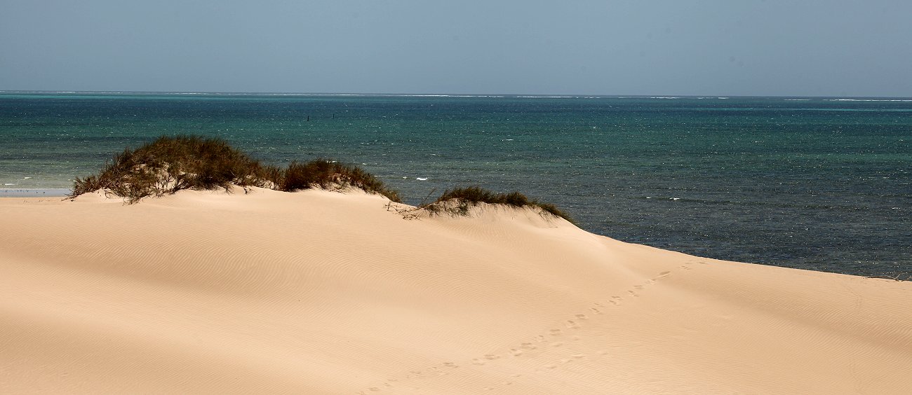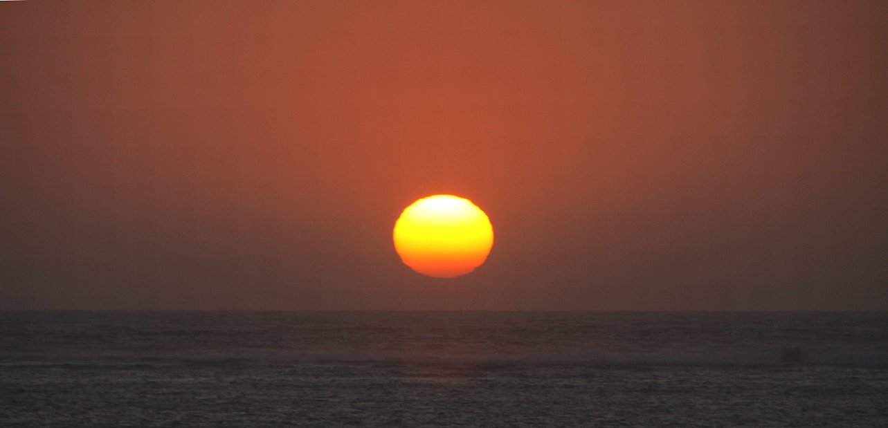 Da wir hier kein fließendes Wasser hatten, war alles etwas schwieriger. Tomoko wusch sich im Auto mit Wasser aus einem mitgeführten 25-l Tank, das sie in eine kleine Wanne gefüllt hatte. Der Himmel war wolkenlos und ließ einen schönen Sonnenuntergang erwarten. Wir aßen aber zunächst das leckere Essen, das Tomoko gekocht hatte. Um 18.15 h nahm ich meine Kamera in die Hand und kletterte die nahe Düne herauf. Von hier oben hatte ich eine fantastische Aussicht auf das Meer und die schnell untergehende Sonne. Die Wellen schimmerten golden, bis die Sonne immer tiefer sank und um 18.30 h endgültig unterging. |