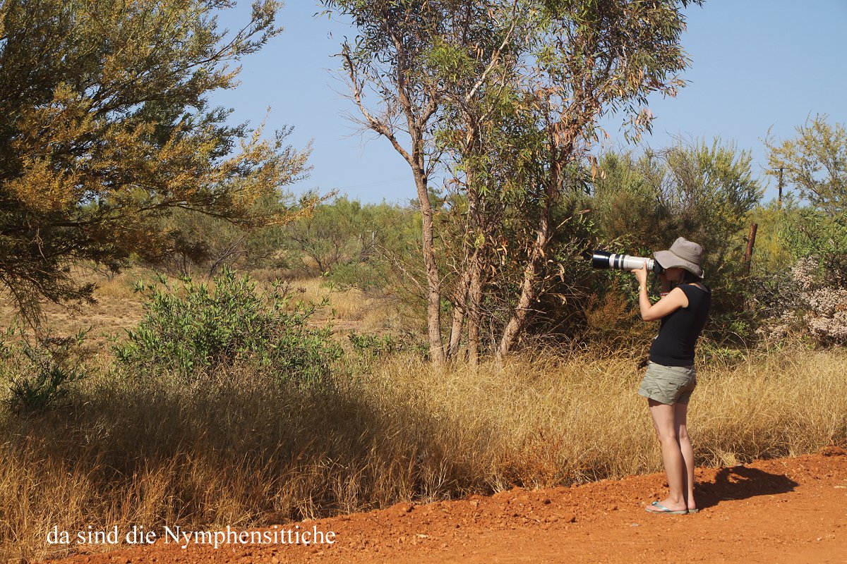 Kurz vor 6.00 h wurden wir wach, nachdem wir wieder gut geschlafen hatten. Es wurde etwas später hell, da wir gestern ein gutes Stück weiter nach Westen gefahren sind. Gegen 6.30 frühstückten wir ganz gemütlich. Heute wollten wir verschiedene Dinge in Exmouth erledigen und dann in den Cape Range Nationalpark fahren. Zunächst aber fuhren wir noch mal zu der Stelle, wo wir gestern bei der Ankunft die Nymphensittiche gesehen hatten. Wir brauchten nicht lange zu suchen bis wir sie fanden, diesmal sogar mit Bäumen und Gras als besserem Hintergrund als die dicken Stromkabel gestern. |