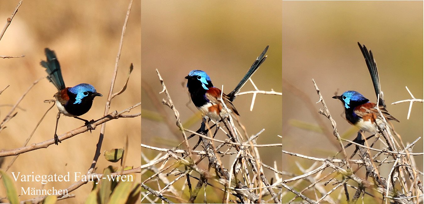Nach ein paar Fotos fuhren wir auf den Campingplatz. Hier waren offensichtlich noch 2 Plätze frei. Als wir aber gerade auf einen gefahren waren, kam ein junges Paar vorbei, das genau diesen Platz reserviert hatte, wie sie uns auf einer Quittung zeigten. Ein Camp Host war auch hier nicht zu sehen. Also räumten wir das Feld, belegten den letzten freien Platz und warteten. Sicherheitshalber ließen wir alles unausgepackt im Auto. Ich inspizierte in der Zwischenzeit mal den Strand und Tomoko erkundete die nähere Umgebung. Dabei konnte sie einen männlichen Variegated Fairy-Wren und einen Singing Honeyeater fotografieren. |