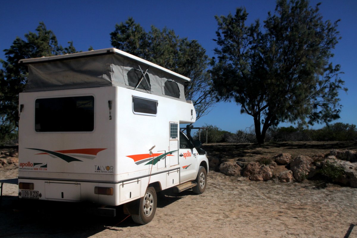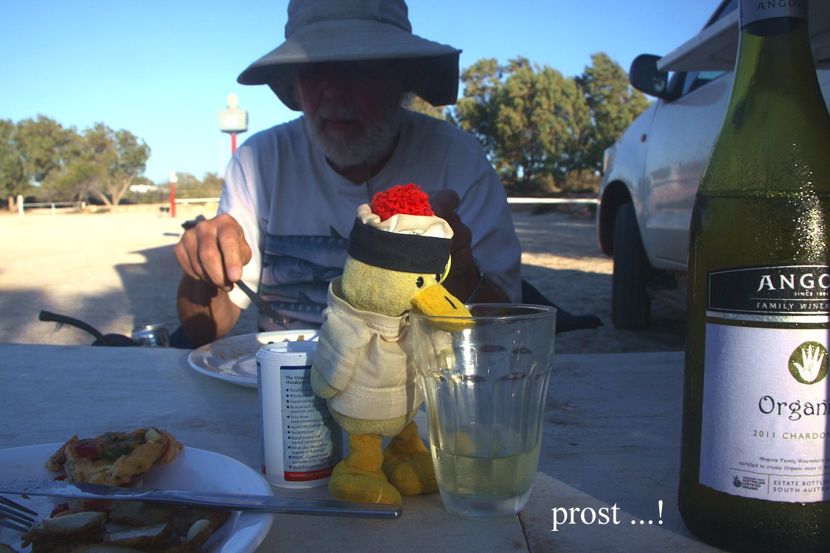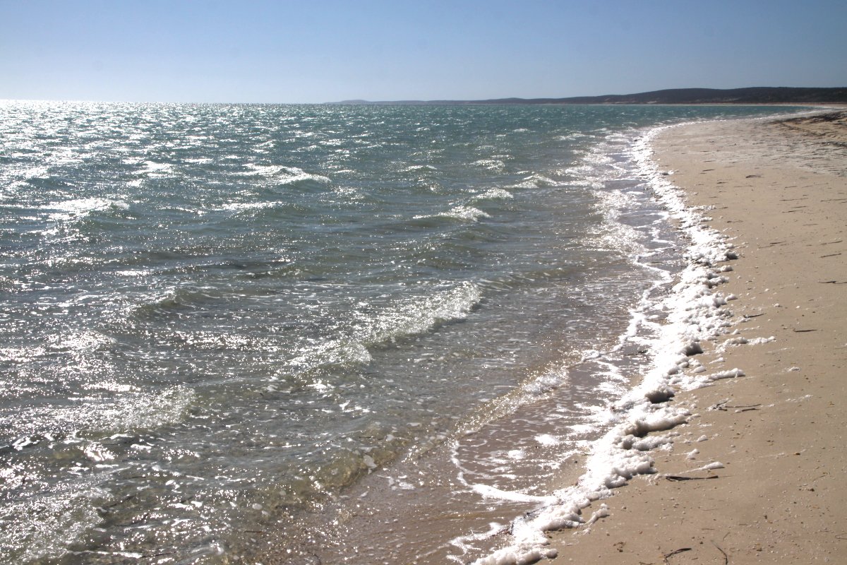 Tomoko schlief ein wenig. Nach 200 km Fahrt erreichten wir gegen 12.00 h die Abzweigung nach Denham / Monkey Mia. Ungefähr 30 km weiter liegt Hamelin an der Shark Bay. Wir hatten eigentlich vor im dortigen Caravan-Park zu übernachten. Als wir aber dort ankamen, machte der Platz keinen besonders einladenden Eindruck auf uns und wir fuhren weiter. Nach gut 50 km kamen wir an eine Abzweigung zur Nanga Bay. Dort bogen wir ab und der dortige Caravan Park sah besser aus, so dass wir hier für 30,- $ einen Stellplatz buchten. Der Wind war inzwischen fast zum Sturm geworden. Ich setzte mich erstmal gemütlich in meinen Stuhl und döste ein wenig vor mich hin. Dann machte ich einen kleinen Spaziergang zum Strand, der menschenleer war. Der Wind peitschte das Wasser so auf, dass am Strand dicke Blasen entstanden, nicht gerade einladend zum Schwimmen.