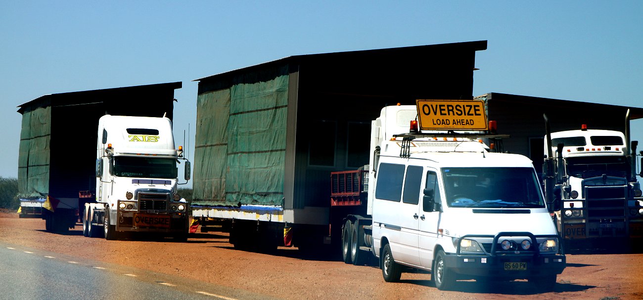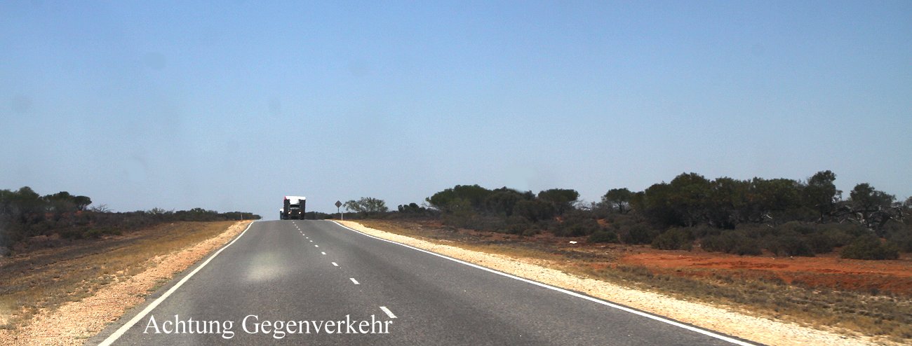 Noch mal ein kurzer Stopp beim ersten Laden, Tomoko hatte Paprika vergessen, dann ging es gegen 9.30 h endlich los. Die Straße Richtung Denham / Monkey Mia führte wieder durch ziemlich eintönige Landschaft, alles flach mit stacheligen kleinen Büschen auf endlosem roten Sand. Einige Schwertransporte begegneten uns, die mit hoher Geschwindigkeit daherfuhren, auf der ziemlich engen Straße nicht ungefährlich.