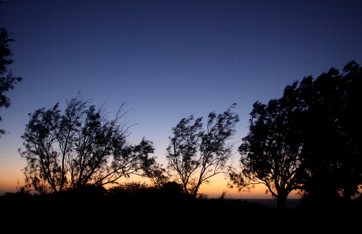 Ich blieb auch nicht lange dort und kehrte wieder um. Tomoko bekann mit den Vorbereitungen zum Abendessen. Ich positionierte unser Auto in eine Stellung quer zum Wind, so dass unser Gaskocher im Windschatten lag. So konnte Tomoko mit dem frischen Gemüse und den frischen Eiern ein leckeres Omelette machen, ohne dass die Gasflamme ausging. Tomoko war etwas enttäuscht, dass wir in den letzten Tagen so wenig Vögel gesehen hatten. Hoffen wir mal, dass das in Monkey Mia, wohin wir morgen weiterfahren wollen, wieder besser wird. Nach dem Spülen duschten wir noch beide und zogen uns dann ins Auto zurück. Die Temperatur betrug mittags "nur" 28° und jetzt am Abend ließ uns der heftige Wind bei 22° nur noch frösteln. Von unserem Stellplatz konnten wir beobachten, wie die Sonne gegen 18.40 h im Meer versank, wobei ihr Licht bis zum letzten Augenblick hell strahlte.