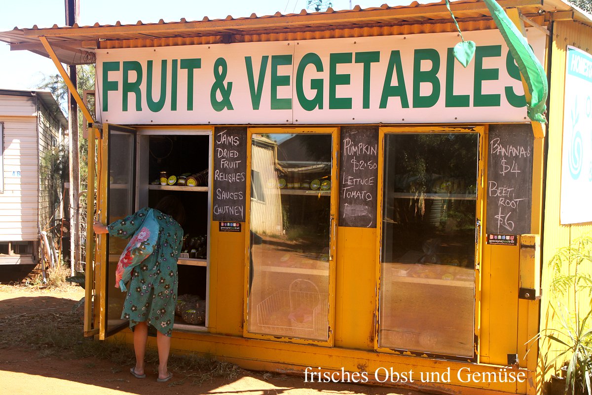 Bei Woolworths machten wir einen ersten Stopp, dort zog ich auch Bargeld aus einem Automaten. Unser nächstes Ziel war eine Organic Farm, wo Gemüse in einem im Freien stehenden großen Schrank angeboten wurde, alles mit Preisen ausgezeichnet. Tomoko nahm einiges heraus. Kein Mensch war zu sehen. Das Geld musste man abgezählt in eine eiserne Büchse einwerfen.