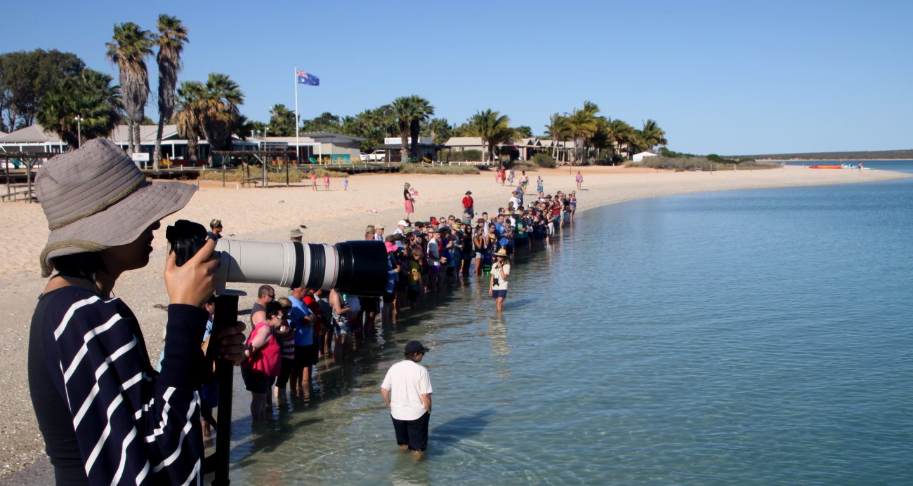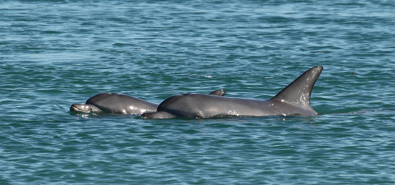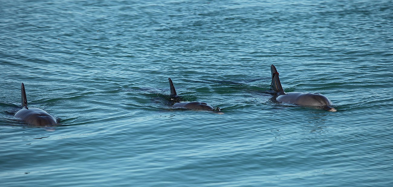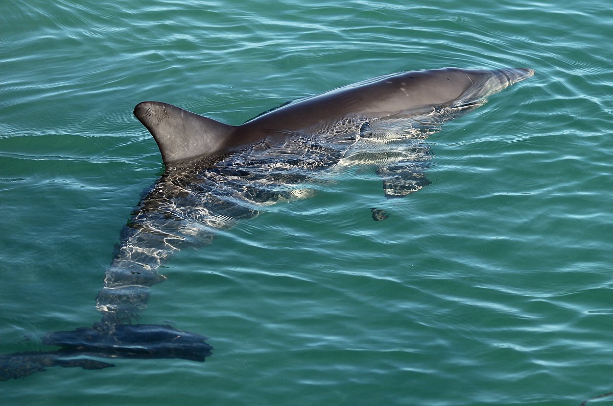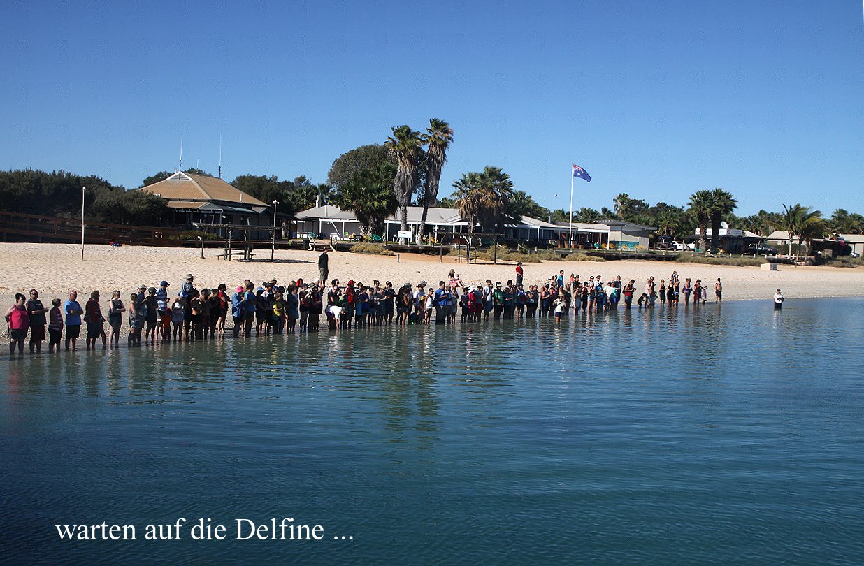 Gegen 7.30 h waren wir zurück am Strand, wo sich jetzt nach und nach über 100 Leute versammelten, die die Delfin-Fütterung beobachten wollten. Einige Delfine (Bottlenose Dolphins) schwammen schon ganz nah am Ufer vorbei.