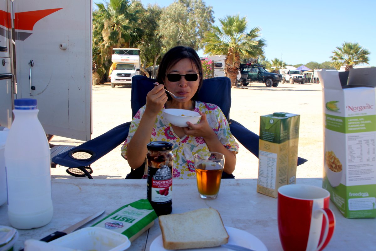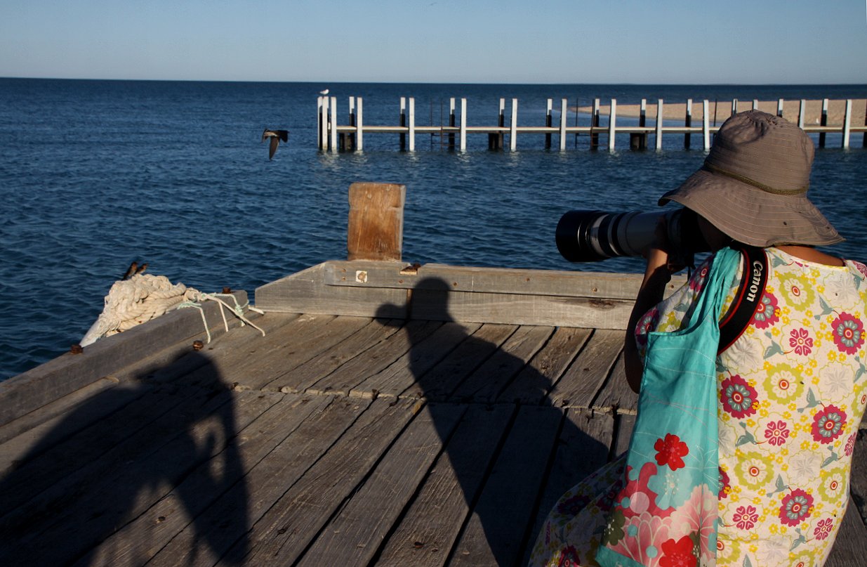 Als aber auch nach einer halben Stunde des Wartens keine Fütterung stattfand, gingen wir zu unserem Stellplatz zurück und machten Frühstück. In der Nähe tauchte wieder der neugierige Emu von gestern auf. Tomoko hatte schon richtige Sorgenfalten auf der Stirn, aber der Emu zog ab,ohne etwas von uns zu wollen. Tomoko fühlte sich etwas erschöpft und legte sich auf die Sitzbank im Auto. Ich spülte schnell das Geschirr und machte dann das Auto fahrbereit, da wir um 10.00 h unseren Platz wechseln mussten. Mit der weiter im Auto hinten liegenden Tomoko fuhr ich die rund 80 m langsam bis zu unserem neuen Stellplatz. Da hier irgendjemand sein Auto dort widerrechtlich geparkt hatte, ging ich zur Rezeption und beschwerte mich.Eine freundliche Angestellte des Caravan Parks rief die betreffende Person an und hinterließ eine Nachricht, dass das Auto entfernt werden müsse. Tomoko war inzwischen wieder wach und arbeitete an ihrer Übersetzung. Ich fing schon mal mit meinem Tagesbericht an. Draußen wurde es währenddessen immer heißer bis 40° erreicht waren, gut dass wir eine Klimaanlage im Auto hatten. Nun wurde es aber Zeit, mal ein Bad in der Bucht zu nehmen. Ich setzte mich einfach bis zum Hals ins kühle Wasser, das vollkommen still war, keine Brandung, noch nicht mal kleine Wellen. Ein Pelikan kam wieder wie gestern ganz nah vorbeigeschwommen. Fast hätte ich ihn mit den Händen berühren können. Hin und wieder sah ich auch einen Stachelrochen bedenklich nahe kommen, die aber wie man mir sagte nicht gefährlich sind. Zwischendurch ging ich immer mal zum Auto zurück, wo ich einen Schlauch an die Wasserleitung angeschlossen hatte, mit dem ich das Meereswasser abspülen konnte. Auf dieser kurzen Distanz von vielleicht 100 m war ich bei Ankunft am Auto schon wieder fast trocken, bei einer Luftfeuchtigkeit von ca. 10% kein Wunder. Zur obligatorischen Kaffeezeit machte Tomoko diesmal Pfannkuchen, sehr lecker. Zwischendurch ging ich mal zur Rezeption und kaufte einen Gutschein fürs Internet, das in unserem Auto zu empfangen war. 450 MB kosteten 10,- $, mal sehen wie lange das ausreicht… Gegen 17.00 h gingen wir beide zum Bootssteg. Eine kleine Meeresschildkröte war zu sehen. Das Federkleid einiger Schwalben (Welcome Swallows) leuchtete in der schon tiefstehenden Nachmittagssonne.