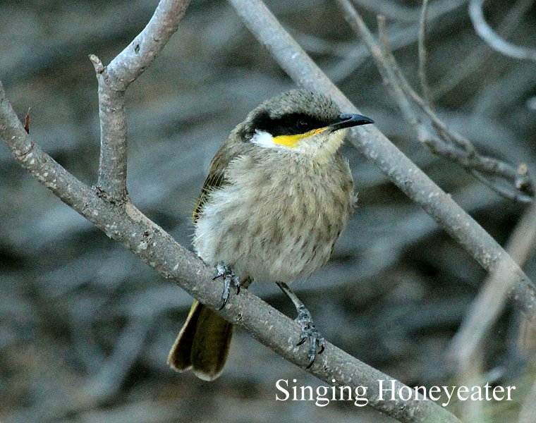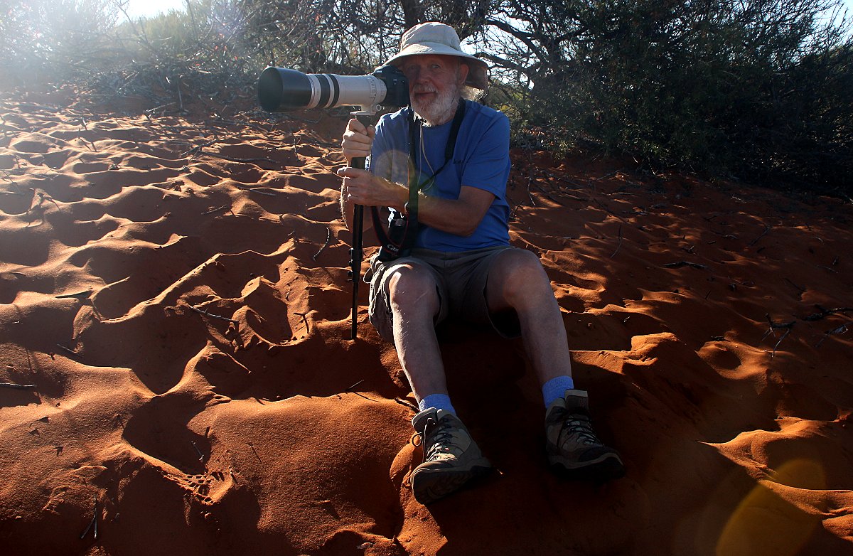 Auf einer kleinen Anhöhe nahmen wir beide im noch kühlen roten Sand Platz und beobachteten die Umgebung. Von dort sahen wir im Sand einen Chiming Wedgebill herumlaufen. Auch mehrere Singing Honeyeaters waren zugegen. In einiger Entfernung saß hoch auf einem Ast ein Crested Bellbird.