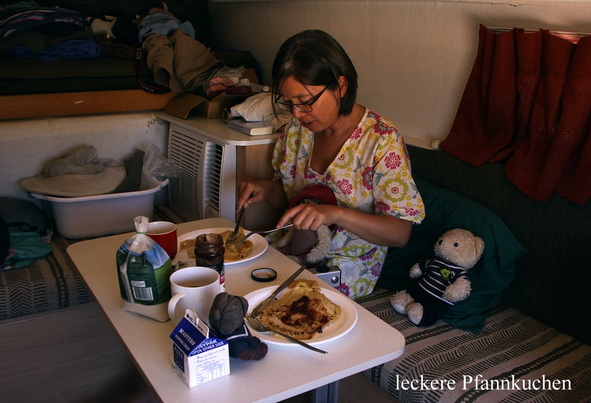 Ansonsten blieb es aber ruhig. Wir studierten die aufgehängten Informationen über die Delfine, die alle einen Namen hatten. Auch ihr Stammbaum war genau aufgeführt. Die Mitarbeiter hier erkennen die einzelnen Tiere ganz genau an ihren unterschiedlichen Merkmalen wie verschiedene Formen ihrer Rückenflosse, sowie unterschiedliche Verletzungen usw. Es war auch jetzt am frühen Abend noch sehr heiß. Der Wind wehte heute nur schwach. Wir gingen wieder zurück und Tomoko fing an zu kochen. Heute gab es Pasta, für mich mit Lachs. Einige Möwen waren sehr interessiert und belagerten uns förmlich. Man musste höllisch aufpassen, dass sie nicht auf den Tisch flogen und unser Essen stahlen. Ich hatte unser Auto parallel zum Meer positioniert, nachdem der Besitzer des auf unserem Platz geparkten Autos sein Fahrzeug weggefahren hatte. So saßen wir bei wieder auffrischendem Wind im Windschatten mit herrlichem Blick auf das Meer.