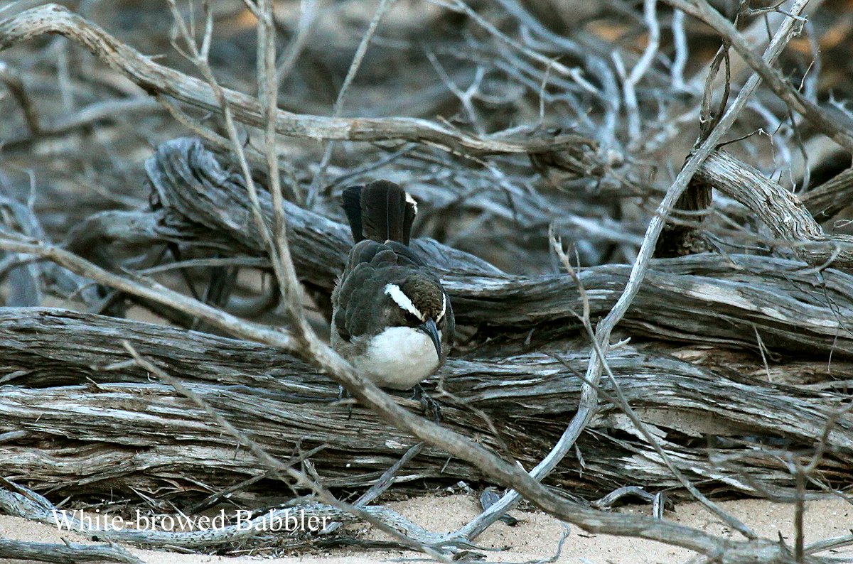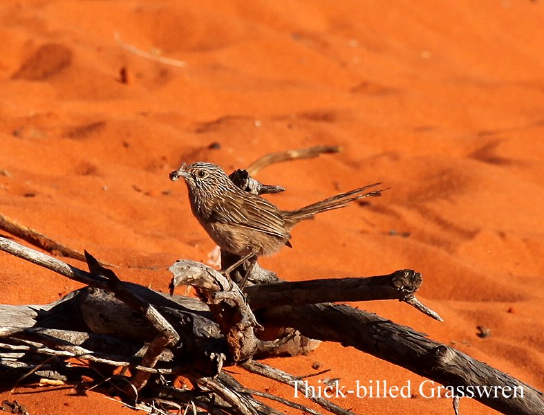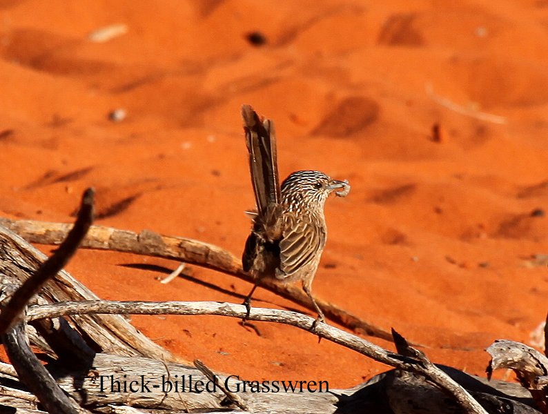 Am Hide selbst war es ruhig. Der davorliegende Pool war ausgetrocknet. Im Sand hoppelte ein Kaninchen herum. Außerdem schien mir die aufgehende Sonne direkt ins Gesicht, so dass ich kaum etwas erkennen konnte. Um 6.15 h kam auch Tomoko an. Ich hatte mir langsam schon Sorgen gemacht. Sie hatte schon etliche Vögel gesehen, u.a. einen Spiny-cheeked Honeyeater und einen White-browed Babbler. Gemeinsam gingen wir den Trail ein Stück weiter. Dabei konnten wir zahlreiche Thick-billed Grasswrens beobachten, die sich mehr schnell am Boden bewegten, als dass sie flogen. Diese Vogelart kommt nur in dieser Gegend vor.