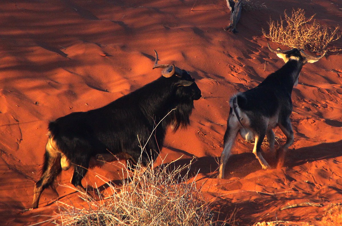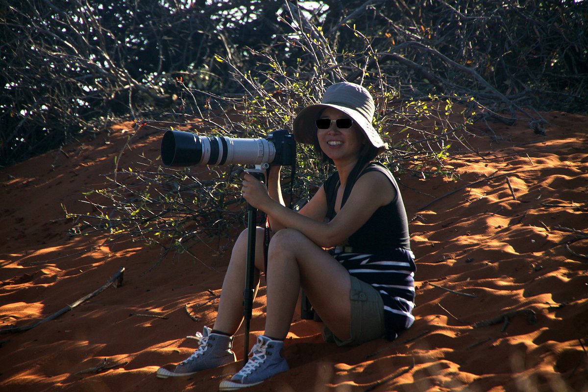 Wir haben es tatsächlich geschafft um 5.30 h aufzustehen. Es war kurz vor Sonnenaufgang, als wir zu einer kleinen Morgenwanderung auf einem Rundweg in der Nähe aufbrachen. Der Wind hatte sich gelegt und es war angenehm kühl. Tomoko ging schon voraus, fand aber irgendwie den richtigen Weg nicht. Gegen 6.00 h erreichte ich die kleine Holzhütte zur Vogelbeobachtung, wo wir uns treffen wollten. Auf dem Weg hatte ich ein paar Ziegen gesehen, darunter ein männliches Tier mit gewaltigen, etwas Schreck einflößenden Hörnern. Auch einen Chiming Wedgebill hatte ich gesehen, wie er am Boden schnell hin und her lief und nach Futter suchte, leider zu weit für meine Kamera.