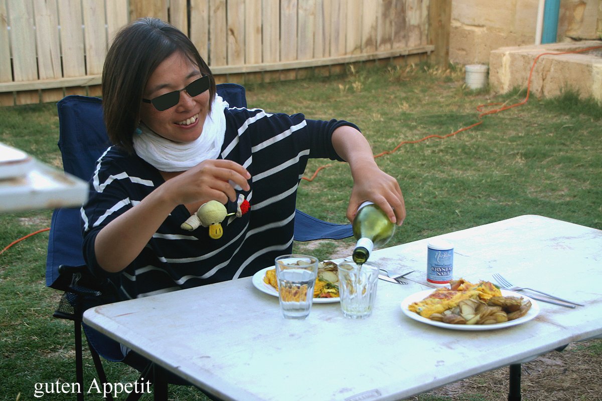 Schnell gingen wir zum Auto zurück. Tomoko fing bald mit Kochen an. Ihr geplantes Essen, Bratkartoffeln mit Omelette (Bohnen, Tomaten und Ei, zusätzlich für mich Lachs), entpuppte sich aber als schwer zu realisieren, da trotz etwas geschützter Lage, der Wind die Gasflamme so stark beeinflusste, dass ein Braten unmöglich war. Tomoko hatte die rettende Idee. Sie hatte vorher die Camping-Küche inspiziert. Hier stand ein großer 2-flammiger Gasherd, auf dem das geplante Essen problemlos gekocht werden konnte. Als alles fertig war, gingen wir mit den gefüllten Tellern zu unserem Platz und aßen draußen. Es schmeckte fabelhaft, dazu noch ein Glas Weißwein, perfekt… Es war allerdings durch den Wind so kühl, dass ich beim Essen wie schon gestern wieder meine warme Fleece-Jacke anziehen musste, um nicht zu frieren. |