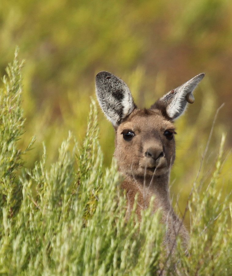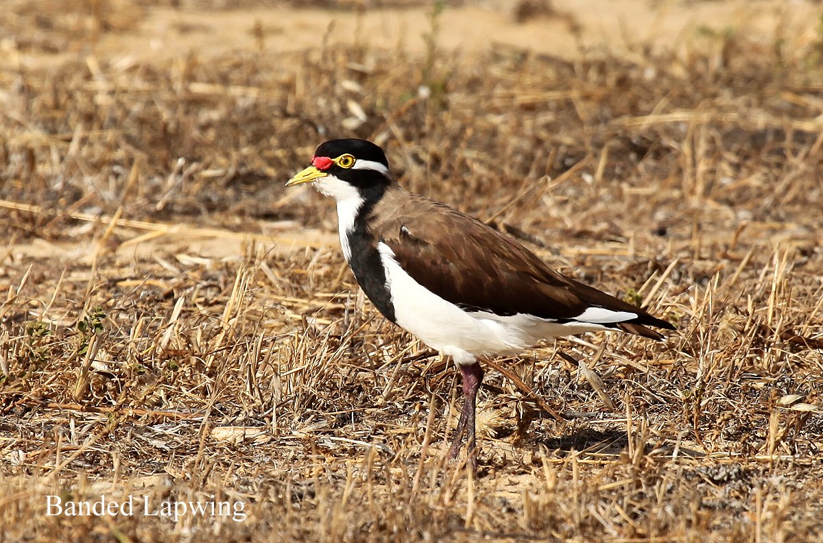 Einige Male kreisten hoch über unseren Köpfen Gruppen von schwarzen Papageien, White-tailed Black-Cockatoos. Die Piste wurde zunehmend schmaler und tiefsandiger, so dass ich den Vierradantrieb zuschalten musste. Es wurde aber immer unwegsamer und da wir nicht im Sand steckenbleiben wollten, drehten wir bei der nächsten Gelegenheit um und fuhren zurück. Da es noch früh war, fuhren wir noch mal an die gleiche Stelle wie gestern morgen. Im jetzt wieder stark auffrischenden Wind sahen wir allerdings nicht viel. Allerdings konnten wir wieder einige Variegated Fairy-wrens und als für uns neue Vögel ein Pärchen Pied Honeyeater beobachten, die aber leider ziemlich weit in den Büschen saßen, so dass uns nur ein einigermaßen brauchbares Foto von einem Weibchen gelang. Auch zahlreiche Kängurus hoppelten durch die Gegend. Die waren alle ziemlich scheu, fixierten uns kurz und sprangen dann mit weiten Sätzen davon. Im Neubaugebiet trafen wir wie gestern wieder auf einige Banded Lapwings. |