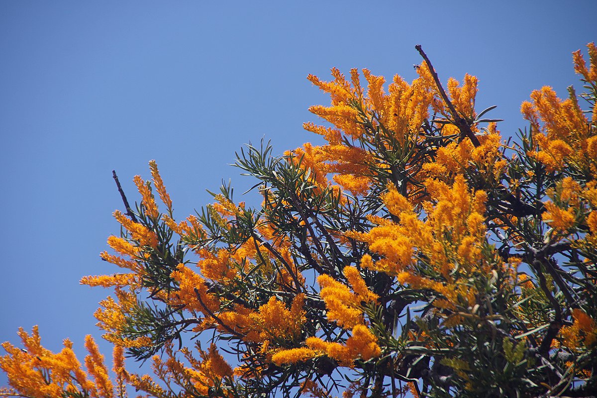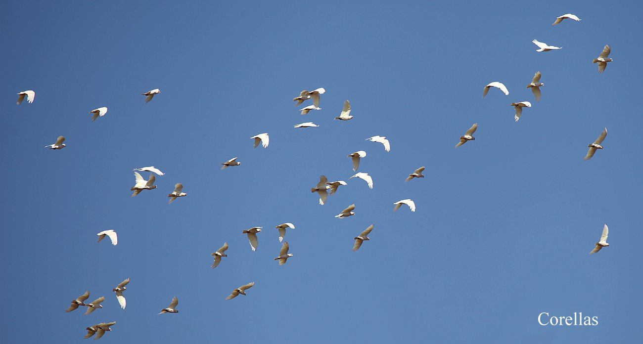 Weiter ging die Reise durch ziemlich eintönige Landschaften. Hin und wieder sorgte ein blühender Baum für eine angenehme Abwechslung fürs Auge. Einmal überquerte uns hoch am Himmel ein Schwarm Corellas. |